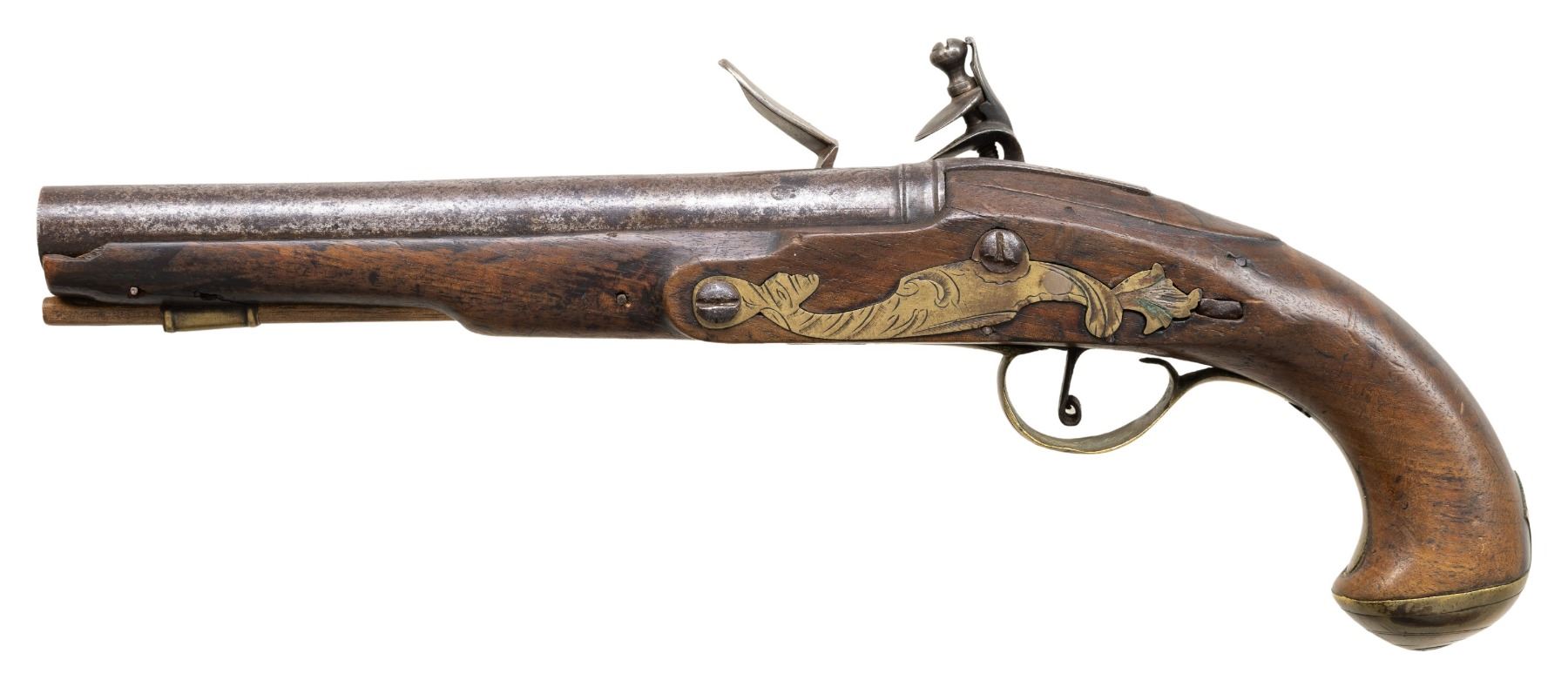 Cal. 69. NSN. Bbl is 8" rnd with smooth bore. Left side of bbl has remnants of remaining Birmingham proofs. Ketland marked reconversion lock. Lock, top tang and breech end of bbl have highlights of scroll engraving. Pin fastened walnut stock. Brass fittings include trigger guard, buttcap and sideplate with flowing scroll engraving. Hardwood ramrod held by a single brass faceted pipe. Ketland pistols and rifles were imported during the Fur Trade period and often associated with Native American use. UNATTACHED ACCESSORIES: several pages of information reprinted "American Heritage Junior Library". CONDITION: metal has faded to gray with worn markings showing scattered pitting. Wood shows heavy wear and marks with a crack at the forearm tip. Wrist and lock area show chips and repairs. Functioning lock. Dark pitted bore. (01-27925/DS). ANTIQUE. $1,000-1,500.