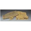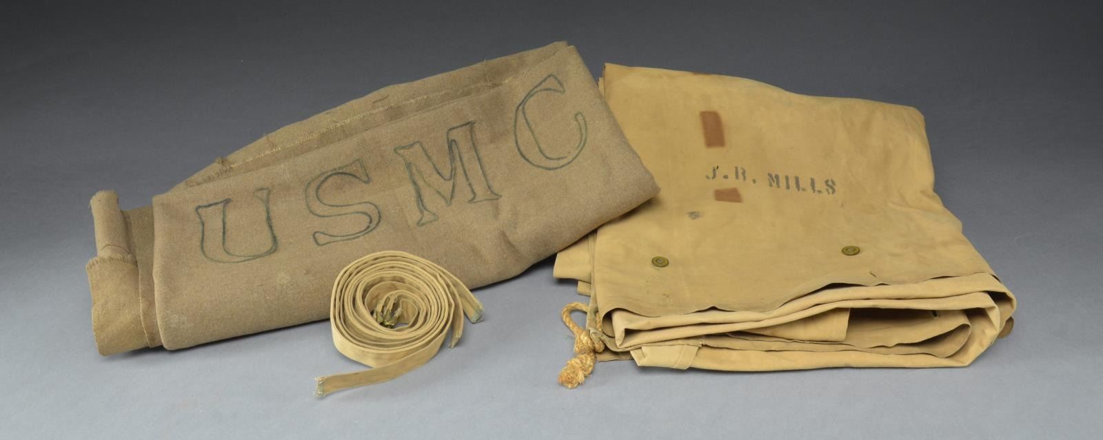 Stenciled markings are "13" & "T" on yellow background in inverted triangle & "REAR ECH". 2 Names appear stenciled in numerous places; "J.R. MILLS" & "P.E. THORNBRUGH". Brass grommets indicate WWII period as WWI models had galvanized grommets. Open face buttons. Body of shelter half measures approx. 65" X 58". Triangular end piece is approx "42" X 58". Group also contains brown blanket w/ 2 green transverse stripes. Blanket measures approx. 54" X 76". Blanket has embroidered "USMC" in center & stenciled in green stripe in white "E.H. WINTER". Also included are 3-1" khaki cloth straps 36" long w/ brass buckles. CONDITION: shelter half has wear, fading & lightly stained appearance w/ several repairs w/ stitched in white thread. May have sm. tears in area of buttoned slots. Blanket has fraying at edges, wear, staining & light scattered insect damage. (02-15909/RW). $600-800.