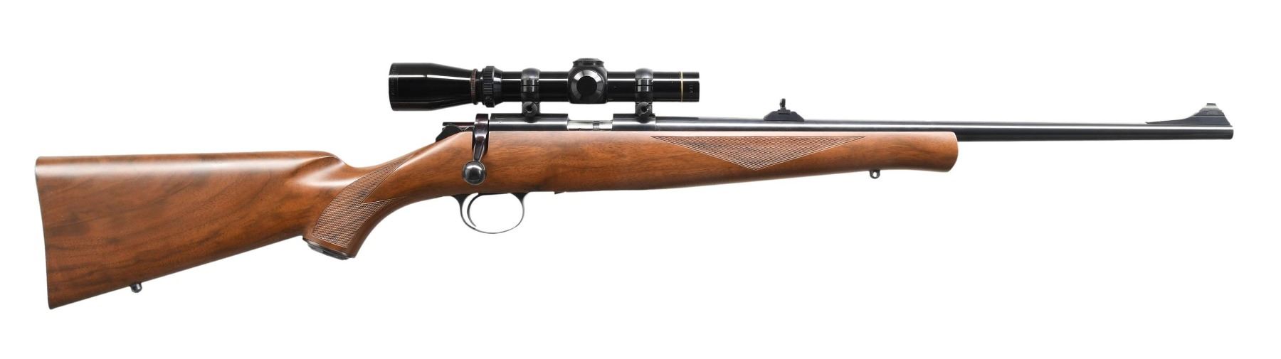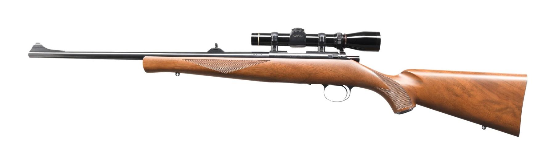 Cal. 22 LR. S# 53915. Bbl. 20". Ramped white bead front sight. Folding rear sight. Receiver-mounted Leupold 1-4x power Vari X-II scope. Scope has a duplex crosshair reticle and very good optics. Bbl. has Clackamas, Oregon marking. Blued finish. Checkered walnut pistol grip stock with bottom-mounted sling studs. MAGS: one 5 rd. CONDITION: stock shows a couple light handling marks. Metal retains 99% original blue. Action functions properly when hand-cycled. Bright, near excellent bore. (24-5913/MJC). MODERN. $1,750-2,500.