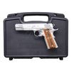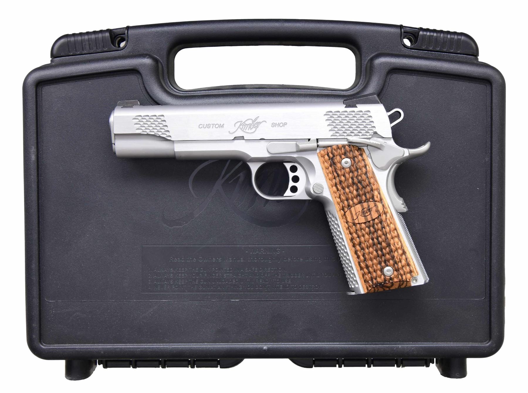 SEMI-AUTOMATIC PISTOL. Cal. 9mm. S# KF120398. Bbl 5". Standard configuration Kimber Stainless Raptor II with night sights, the rear sight similar to a Novak Combat. Exaggerated skeletonized hammer, skeletonized trigger, ambidextrous extended safety, and grip safety with extended tang. The left side of the slide is marked "CUSTOM KIMBER SHOP". The right side sports "STAINLESS RAPTOR II" with the right frame marked with the manufacturer, location in "Yonkers, NY", and the serial number "KF120398". The slide is generously machined with gripping scales on either side of the muzzle and below the rear sight. Similar, but much deeper scaling has been machined into the front strap with the flat main spring housing finely checkered. Scaled hardwood grips with a central encircled "Kimber" trademark secured with allen head screws. Brightly polished magazine with 8 indicator holes marked "9mm" on the left side, "KIMBER 9" on the floorplate. MAGS: 1 - 8 rd. UNATTACHED ACCESSORIES: matching factory hard case. CONDITION: the pistol presents as virtually new, with no scuffing on the barrel hood, marring of the stainless steel surface and no discoloration or handling marks on the grips. Mirror bore. Perfect manual mechanics. PROVENANCE: from The Collection of Gun Sport Ltd owned by Jon R. Thomas. (23-4547/LA). MODERN. $850-1,350.