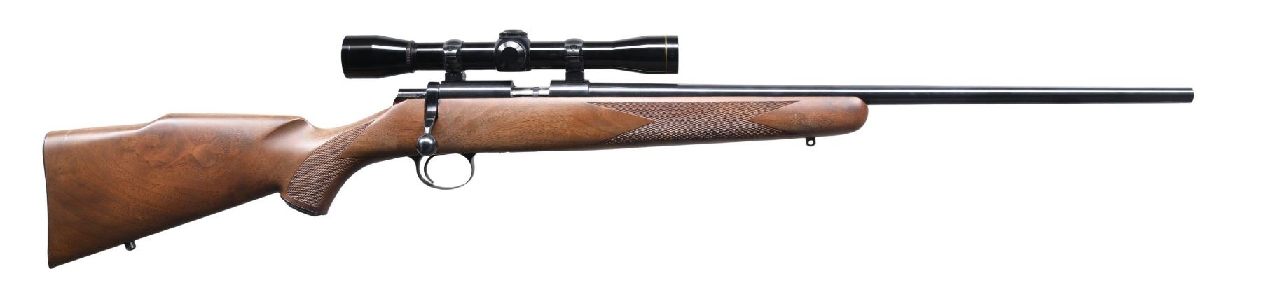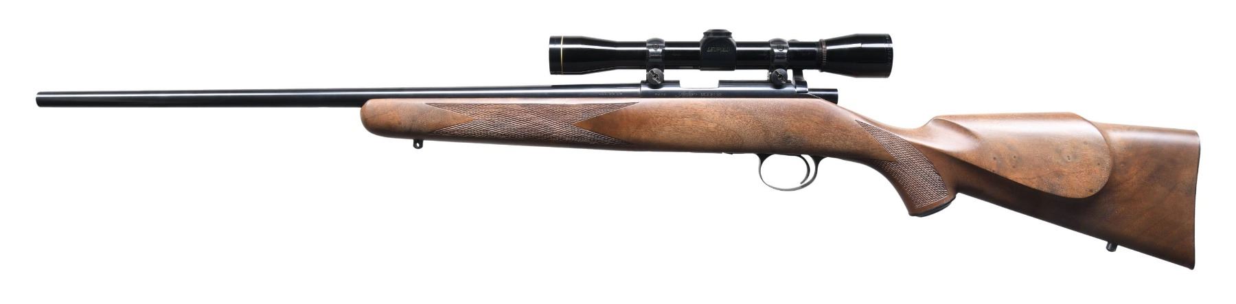Cal. 22 LR. S# 4270. Sporter 22.5" barrel. Leupold M8-4x (mfg. 1981) scope with duplex reticle on tip off rings. Checkered Claro walnut stock with Monte Carlo cheekpiece & Neidner style checkered steel buttplate. MAGS: 1 - 5 rd. CONDITION: all aspects near excellent including bore. Scope has clear & serviceable optics. (24-7134/MD). MODERN. $500-750.