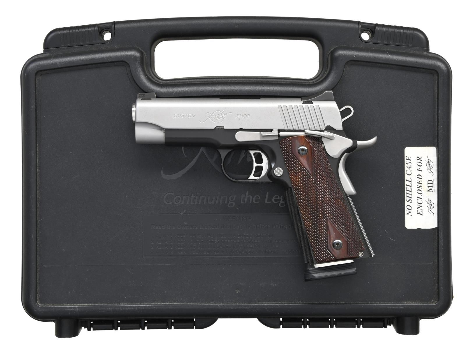 Cal. 45 ACP. S# KR229781. Bbl. 4". Three dot night sights. Stainless steel slide. Dull gray finished frame w/ stippling. Extended ambi safety. Extended beavertail grip safety. Rosewood checkered grips. MAGS: 2-8 rd. one aftermarket & one factory. UNATTACHED ACCESSORIES: matching numbered factory hardcase w/ manual, cable lock & paperwork. CONDITION: very good overall w/ some light oxidation on slide dings, operational & handling wear from use. Very good bright bore. (23-5220/MJC). MODERN. $700-1000.