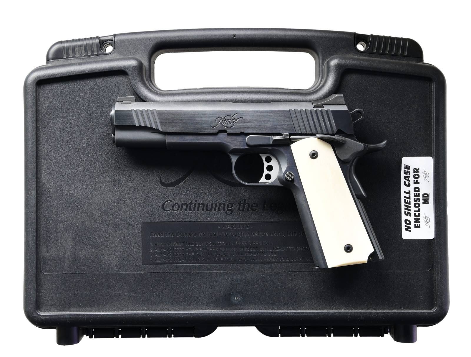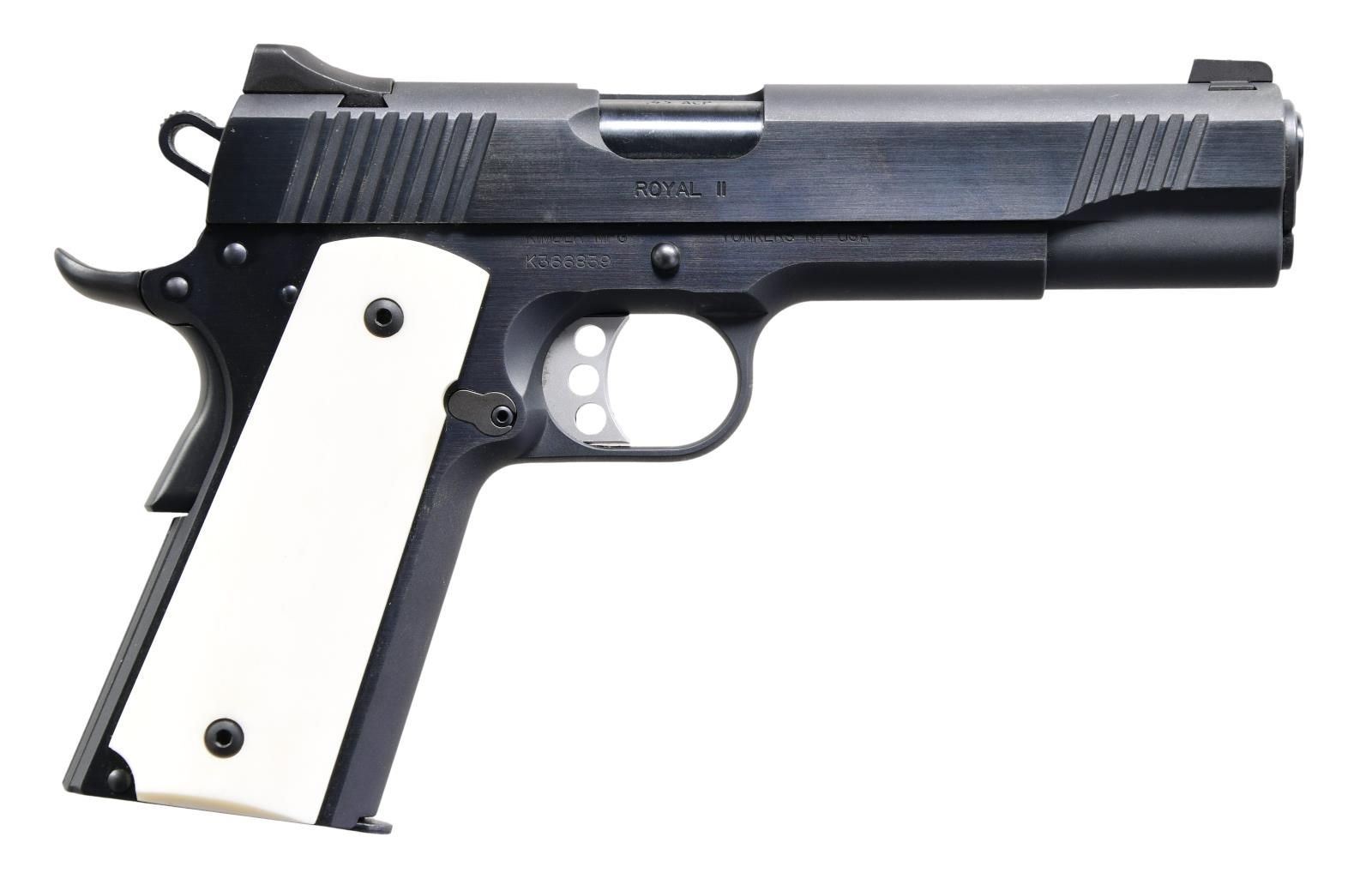Cal. 45 ACP. S# K366839. Bbl. 5". Blade front sight. Fixed square notch rear sight. Extended beavertail grip safety. Extended right-hand safety. Blued finish. Faux ivory grips. MAGS: 1-7 rd. UNATTACHED ACCESSORIES: matching-numbered factory hardcase w/ manual & paperwork. CONDITION: grips show light handling wear. Slide shows some light scratches & edge wear. Bright, near-excellent bore. PROVENANCE: the collection of Gun Sport Ltd., owned by Jon R. Thomas. (23-4082/MJC). MODERN. $800-1,200.
