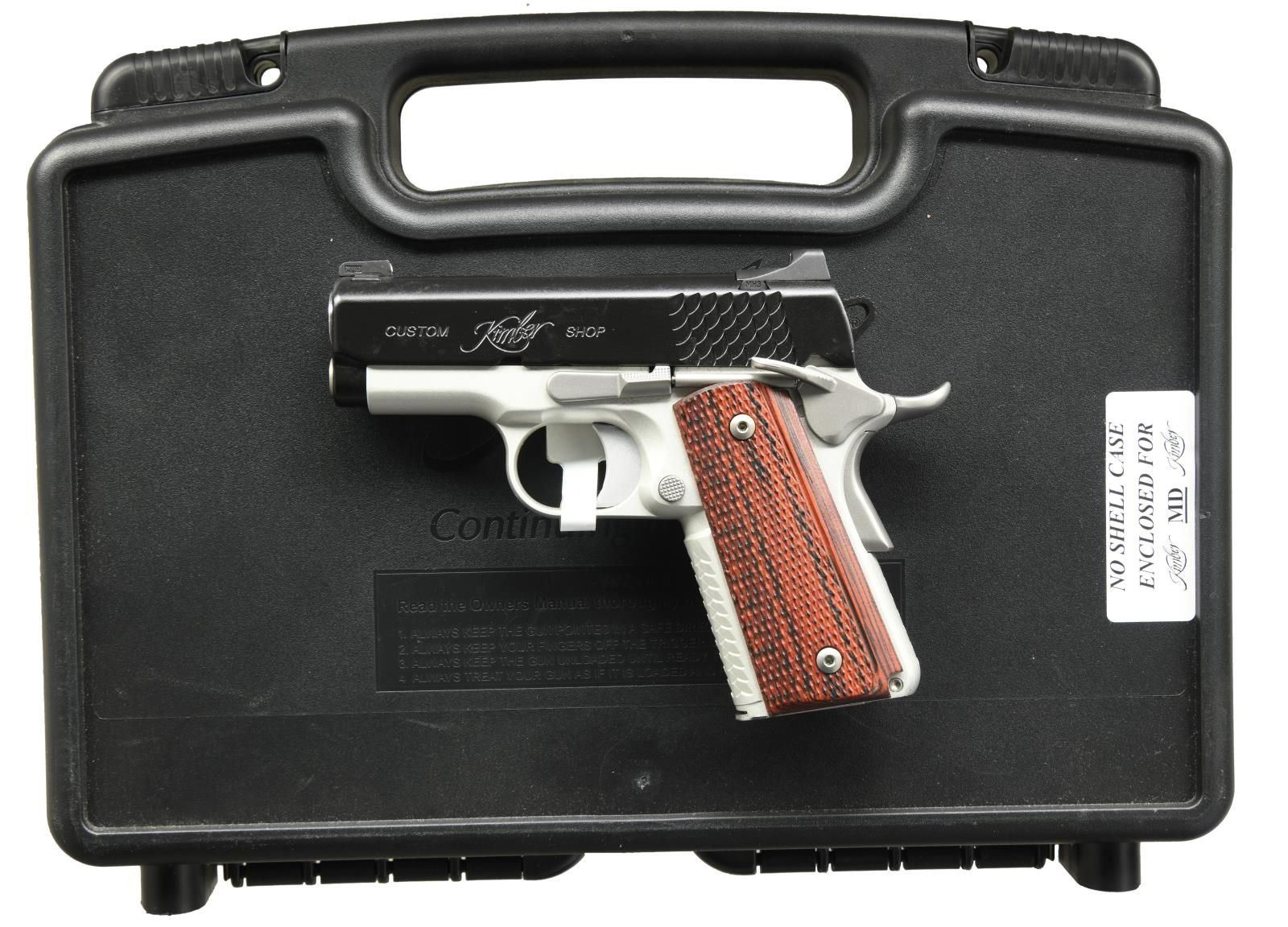 Cal. 45 ACP. S# KU266058. Bbl. 3". Three dot night sights. Matte black slide. Satin silver aluminum frame. Extended ambi safety. Extended beavertail grip safety. Checkered grips. MAGS: 1-7. rd. UNATTACHED ACCESSORIES: matching numbered factory hardcase w/ manual, cable lock, fired shell case, & two spare mag baseplates. CONDITION: all aspects near new, in the box. PROVENANCE: the Collection of Gun Sport Ltd owned by Jon R. Thomas. (23-3336/MJC). MODERN. $800-1200.