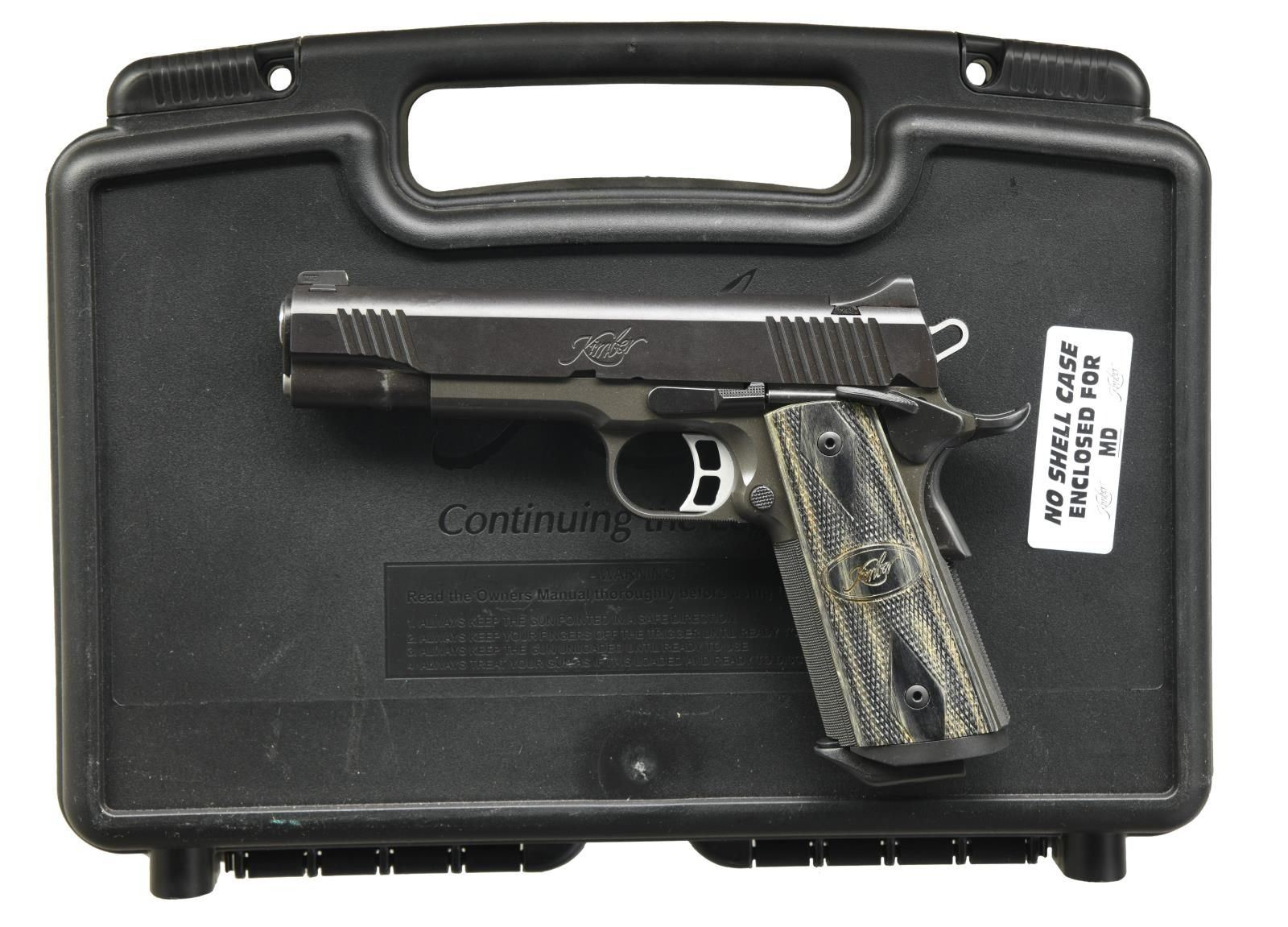 Cal. 45 ACP. S# K434982. Bbl. 5". Three dot night sights. Matte black slide w/ front & rear serrations. Gray finished frame w/ stippling. Extended ambi safety. Extended beavertail grip safety. Laminated checkered grips w/ Kimber logo. MAGS: 1-7 rd., marked "J&J". UNATTACHED ACCESSORIES: matching numbered factory hardcase w/ manual, cable lock, paperwork, & bushing wrench. CONDITION: all aspects near new, in the box. PROVENANCE: the Collection of Gun Sport Ltd owned by Jon R. Thomas. (23-3067/MJC). MODERN. $800-1,200.