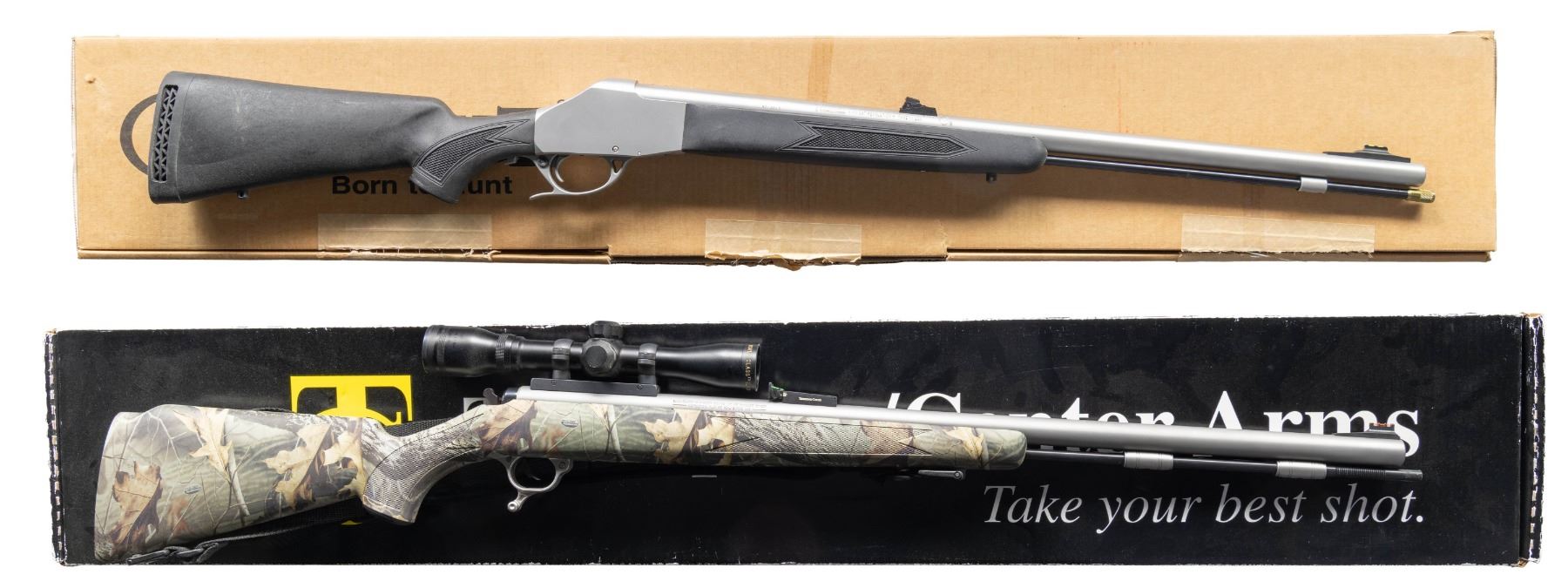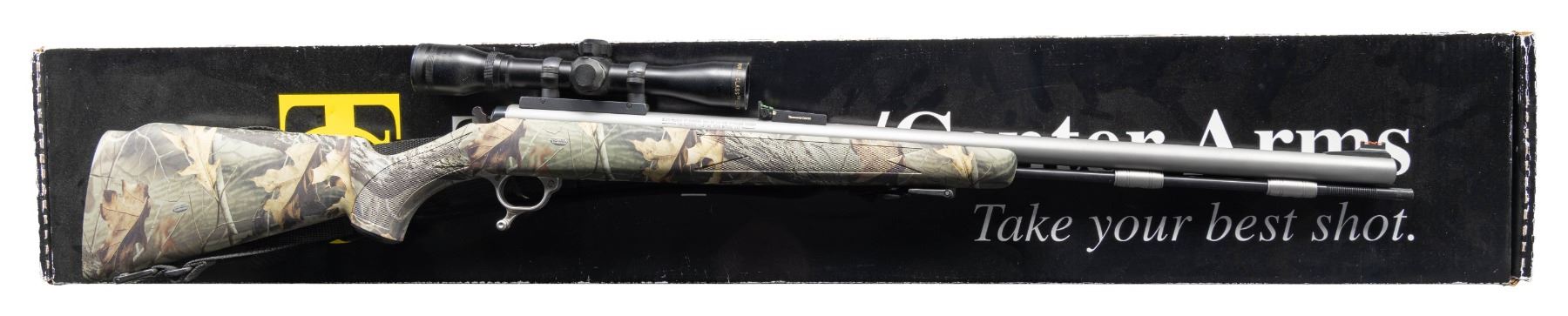 2) TC OMEGA. Cal. 50. S# S7675. Bbl. 28". Fiber optic sights with adjustable rear. Receiver mounted Tasco World Class 1x32 scope. Scope has duplex crosshair reticle & very good optics. Stainless finish. RealTree hardwoods camoflauge finished synthetic stock with bottom mounted sling swivels & aftermarket sling. Buttplate is detached from gun but present inside box. Ramrod present. UNATTACHED ACCESSORIES: matching numbered factory box , rubber buttplate & rubber scope lens covers. CONDITION: all aspects near excellent. (01-25515/MJC). ALL ANTIQUE. $400-600.