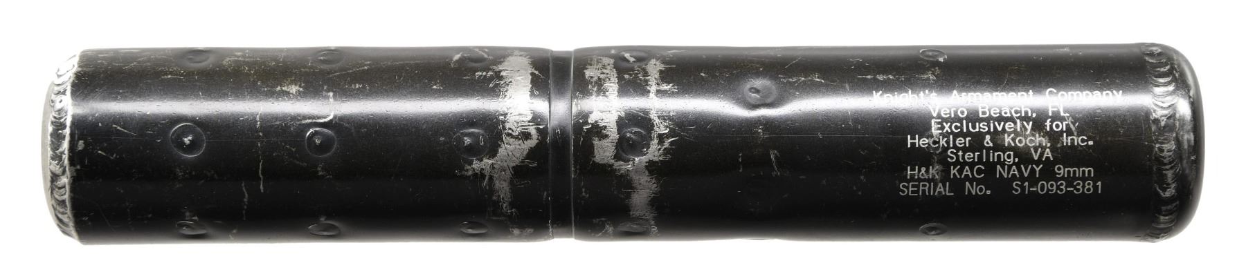 Cal. 9mm. S# S1093381. H&K KAC-Navy 9mm suppressor manufactured by Knight's Armament Company exclusively for HK to be used on the MP5N, with desirable Vero Beach, FL address (indicating an early production model). Stainless steel w/ black finish. 7.75" in length w/ an outside diameter of 1.375". 1.1 lbs. Direct thread 1/2"x32 TPI. CONDITION: Finish is thin on high spots. End cap demonstrates light malformation due to apparent bullet strike. Exit still measures 0.38". NATIONAL FIREARMS ACT SOUND SUPPRESSOR REQUIRING BATF TRANSFER BEFORE TAKING POSSESSION. FULLY TRANSFERABLE.(03-1759/JZ). MODERN CLASS III. $800-1,400.