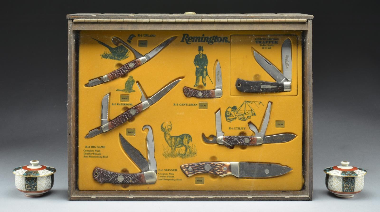 1) KNIFE DISPLAY. A store display containing 7 unused Remington knives. Knives include the Trapper Bullet knife R1128, Utility knife R4, Skinning knife R6, the Gentleman R5, the Waterfowl R2 & the Upland R1. CONDITION: all knives are unused w/ original boxes contained inside the store display.