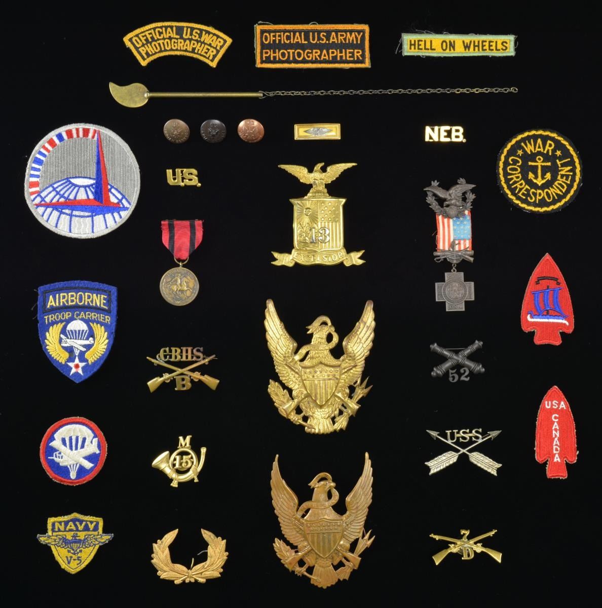 2) PATCHES. A riker mount display case containing patches that include but are not limited to US Army photographers, War Correspondent, Hell on Wheels, Airborne Troop Carrier, Navy V5 & more. CONDITION: patches show light wear.