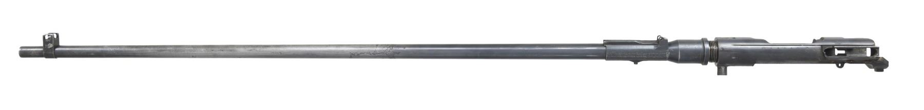 Cal. 6.5 Jap. S# 11019. Bbl. 31 1/2". Blade front sight with protective ears. No rear sight present. 24th series Kokura Type 38 receiver with bbl. that is not screwed in properly. Chamber is plugged. Ground mum. No other parts present. Blued finish. CONDITION: metal shows a large area turned to a silvery gray on front half, scattered pitting, oxidation & strong traces of bluing. Dark bore with scattered oxidation & pitting. (25-3062/MJC). MODERN. $25-50.