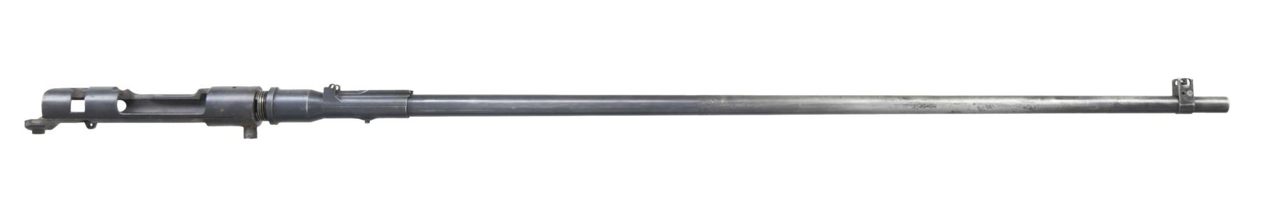 Cal. 6.5 Jap. S# 11019. Bbl. 31 1/2". Blade front sight with protective ears. No rear sight present. 24th series Kokura Type 38 receiver with bbl. that is not screwed in properly. Chamber is plugged. Ground mum. No other parts present. Blued finish. CONDITION: metal shows a large area turned to a silvery gray on front half, scattered pitting, oxidation & strong traces of bluing. Dark bore with scattered oxidation & pitting. (25-3062/MJC). MODERN. $75-150.