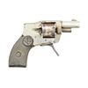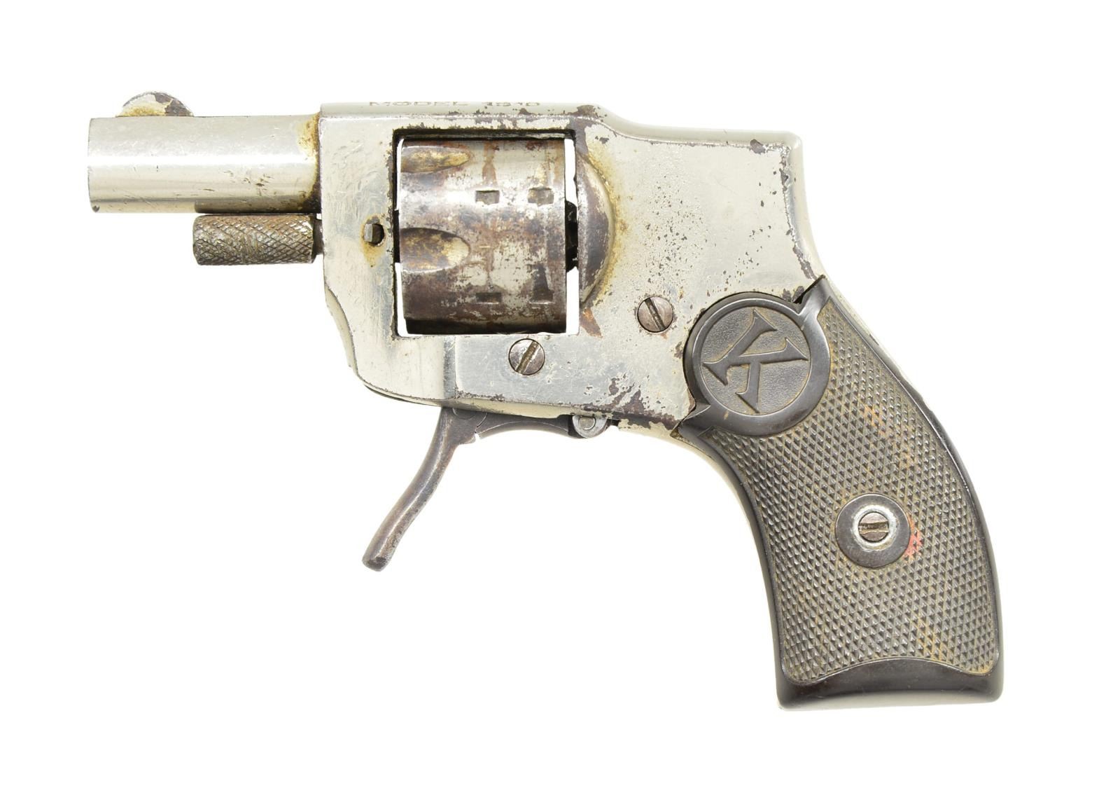 Cal. 22 RF. S# 470. Bbl. 1 3/8" with blade sight. Mfg. 1897-1916 in Philadelphia with nickel plating. Uncommon push button cyl. rod release. Folding trigger, 6 rd. fluted cyl. and Kolb logo checkered hard rubber grips. CONDITION: fair appearance with noticeable finish loss on cyl. and peppery flaking on balance. Missing mainspring plus non functional mechanics. Good appearing grips with small chips along backstrap and slight separation at butt. Poor worn and pitted bore. PROVENANCE STATEMENT: Estate collection of Thomas F. Wolfinger. (22-6153/NW). CURIO. $75-125.
