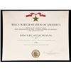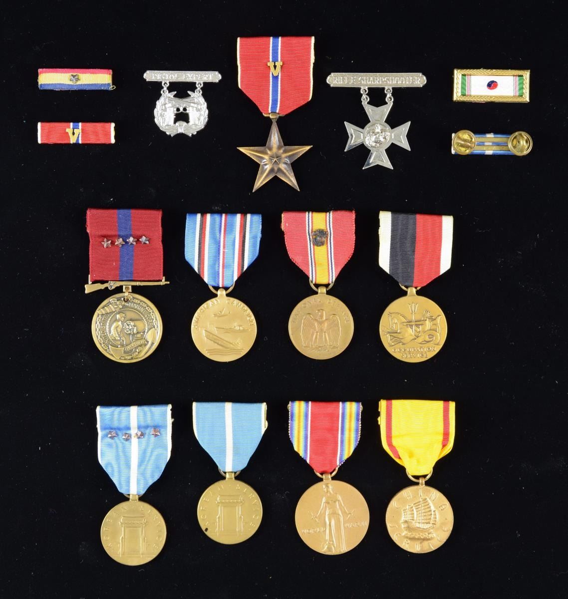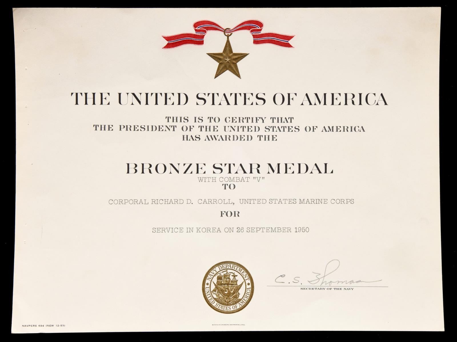 CARROLL OF THE MARINE CORPS. This group includes 1 North Korean Officer's uniform coat in OD cotton. Uniform has 5 dark brown plastic buttons down the front bearing a star with a Korean letter in the center. Collar tabs are red with hammer & sickle enamel brass centers. Red shoulder boards with silver bullion and a single silver star. / 1 Marine Corps swagger stick measuring 22” in length with an EGA on the pommel. / 1 Group of medals that includes 2 US Korean Service, Marine Corps Good Conduct, Bronze Star with “V”, WWII Army of Occupation, American Campaign Medal, WWII Victory Medal, National Defense Medal, China Service Medal, Rifle Sharpshooter Badge, & Pistol Expert Badge. / 1 Large group of Korean War related ephemera & photographs, including a book titled “CHOSIN HEROIC ORDEAL OF THE KOREAN WAR”. Lastly, there is an award document to Corporal Carroll for the Bronze Star. CONDITION: items generally show light wear. Ephemera shows wear & discoloration. Some photos are damaged. PROVENANCE: from the Lifelong Collection of Glen E. Mattox. (02-18675/BF). $200-400.