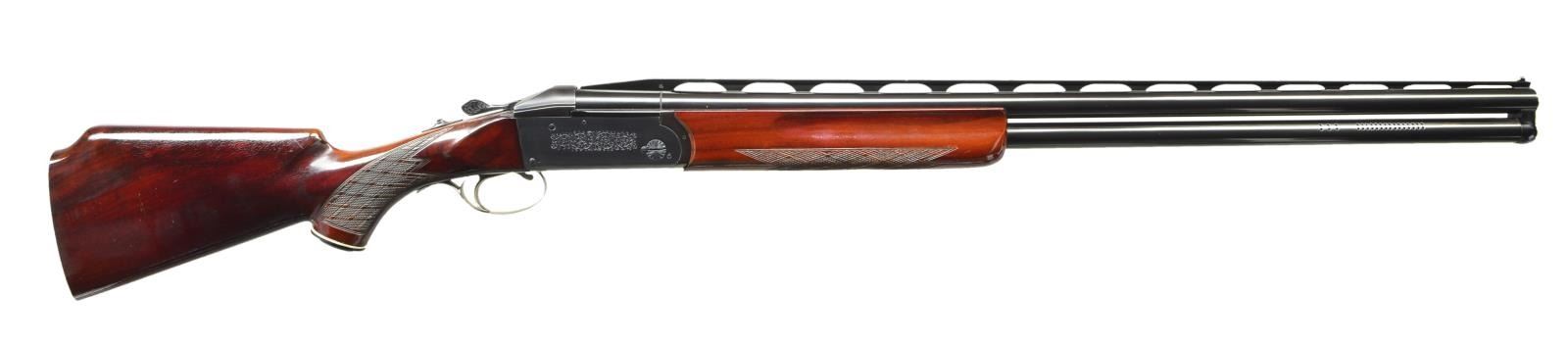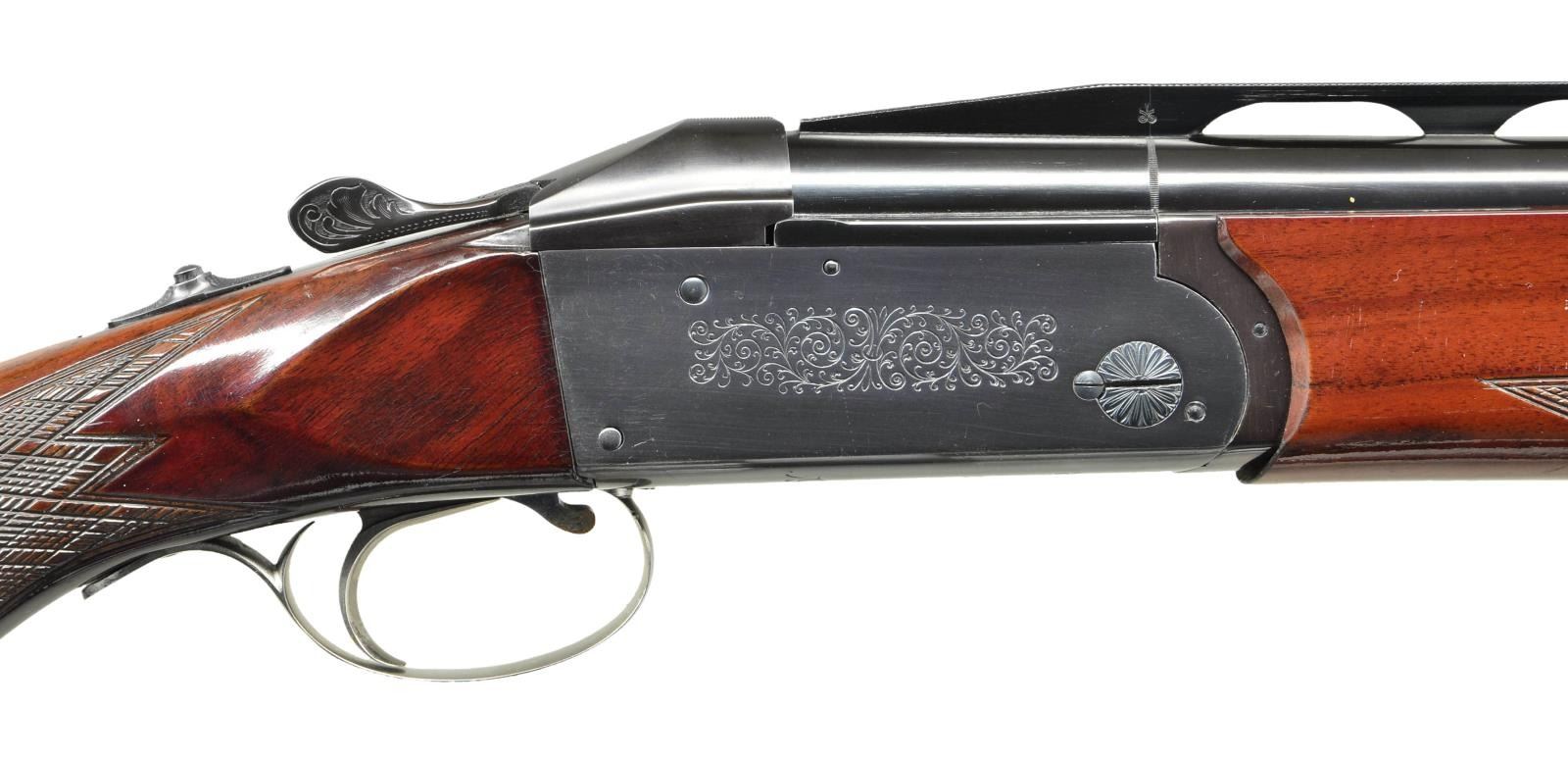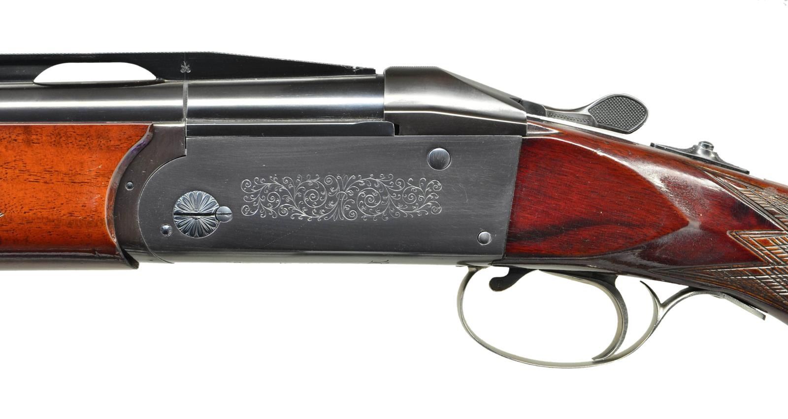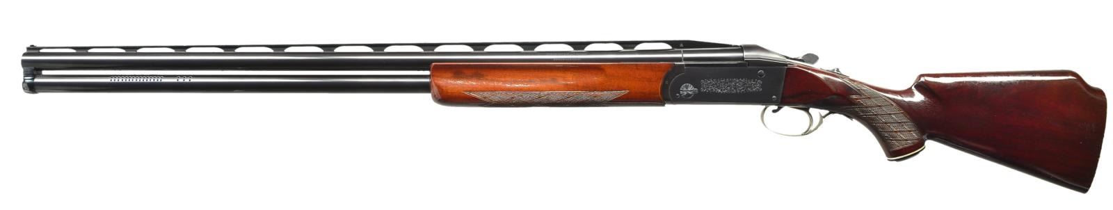 Cal. 12 Ga., 2 3/4". S# 297. Bbls. 30” have raised matted ventilated rib and are marked for FULL and IMOD fixed chokes. Bottom bbl. is ported. Bottom of monobloc is stamped with October 1973 Ulm Nitro proofs and with serial number. Blued K32 O/U action features nonautomatic safety and single selective trigger. Sides of action are decorated with varying size scroll. Bottom is marked “KRIEGHOFF” “MODEL 32”. Replacement coin finished trigger guard has scroll engraving on bow. Dark red varnished capped pistol grip Monte Carlo buttstock measures 14" over black “Whiteline” pad on 1/4" spacer. Skipline checkering is at grip. Target forend has matching number on iron, but color of wood does not match buttstock. MEASUREMENTS: BBLS: Bore Diameter: T .739", B .732". Restriction: T .033"(FULL), B .021"(MOD). Min. Wall Thickness: T .038", B .038". STOCK: DAH: 2 5/16". DA REAR OF MONTE CARLO: 1 1/2". DAC: 1 1/2". LOP: 14". CAST: neutral. WEIGHT: 8 lb. 7 oz. UNATTACHED ACCESSORIES: gun is housed in aluminum Americase lined in burgundy velvet and has space for two bbl. sets and contains stock removal tool. Also included is an invoice for work done by Clay Target Sports in 1996 for parts and labor totaling $556. CONDITION: fine, factory replacement bbls. retain nearly all of their original blue. Action appears to be reblued and retains nearly all of that blue. Stocks retain nearly all of their original varnish which shows overall light crazing on buttstock. Pad is not firmly screwed to butt and needs attention. Bores are bright and shiny. Mechanically good. Trigger guard tang is not correctly fitted. Case is good, interior with some compressions. (22-2113/MGM). CURIO. $1,750-2,500.