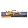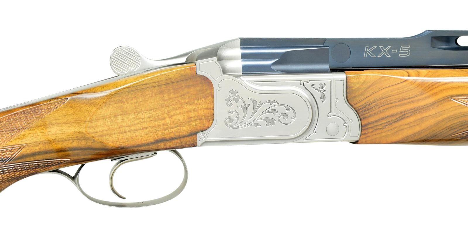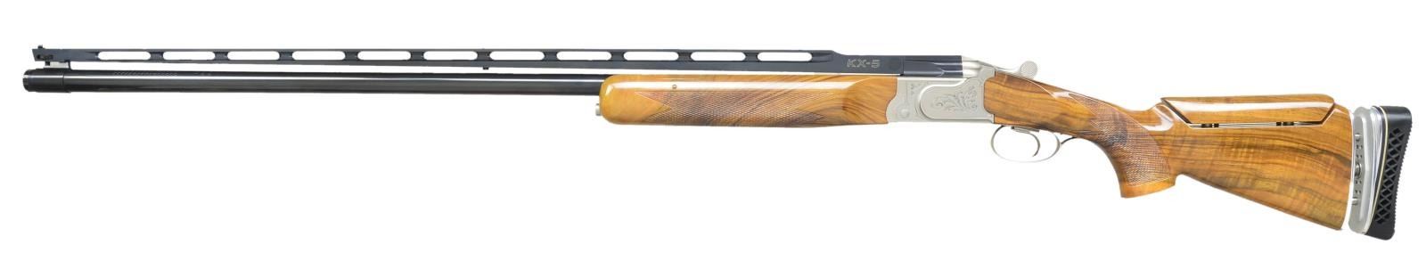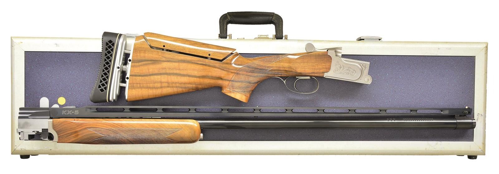 Cal. 12 Ga. 2 3/4". S# 020782. The 34" ported monobloc bbl. is fitted with choke tubes & high ventilated rib adj. for point of impact. Both sides of rear portion of rib are marked "KX-5". Serial number & Ulm proofs are on bottom of monobloc. Coin finished trigger plate type action has no safety & is fitted with factory release single trigger with blade adj. for position. Sides of action have some open scroll engraving & bottom of action is marked "KRIEGHOFF" "GERMANY" "KX-5". Ambidextrous pistol grip stock of well figured & lightly streaked European walnut features adj. recoil absorbing buttplate by Pachmayr & adj. comb. Bottom of stock is marked with release trigger warning. Point pattern checkering is at grip. Matching beavertail type forend has Anson release. WEIGHT: 9 lb. 3 oz. UNATTACHED ACCESSORIES: gun is housed in aluminum Americase marked "Krieghoff". Interior is lined in blue velvet with "Krieghoff, a tradition of performance" embroided in gold in lid. Case contains 2 choke tubes, stock tool, various allen wrenches & instruction manual. CONDITION: very fine. Gun showing very little use except for some assembly marks and a few minor marks & dings in all exterior finishes. Most notably, a hardened drop of oil on left side of forend. Case is fine with some marks on exterior. Interior cloth shows some compressions. Combination lock does not work. (22-2114/MGM). MODERN. $3,500-5,000.