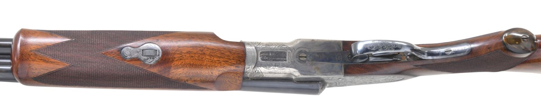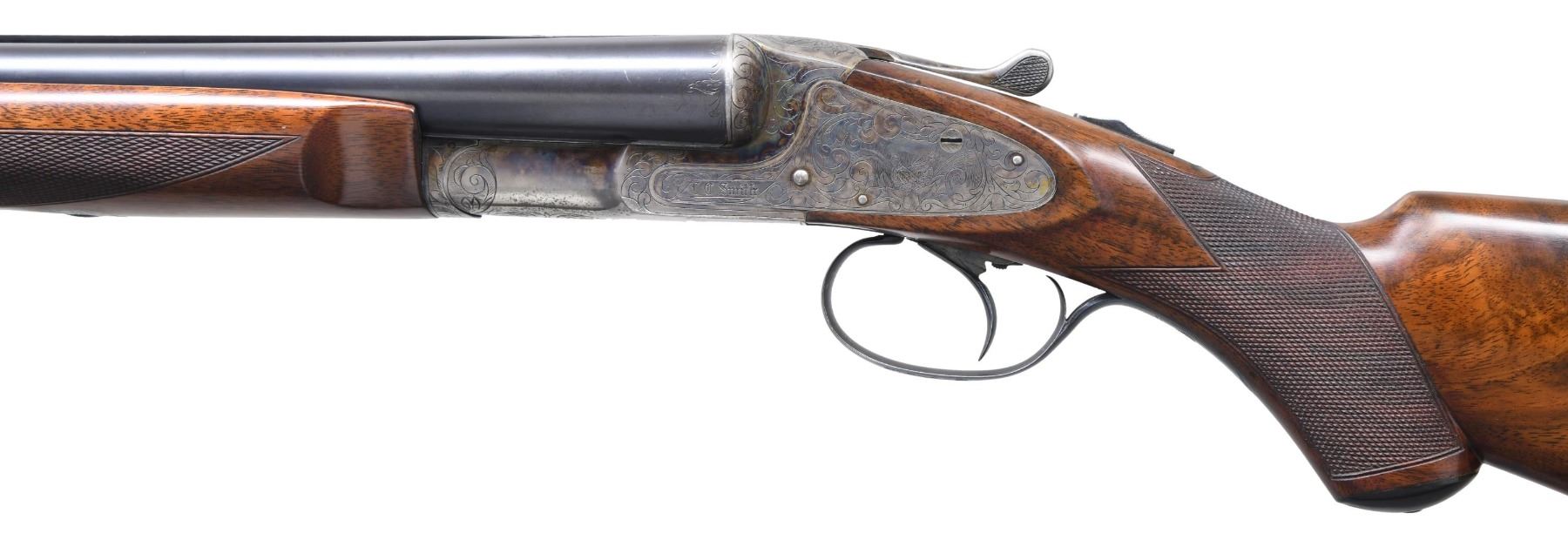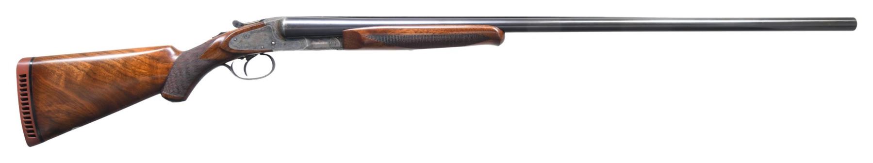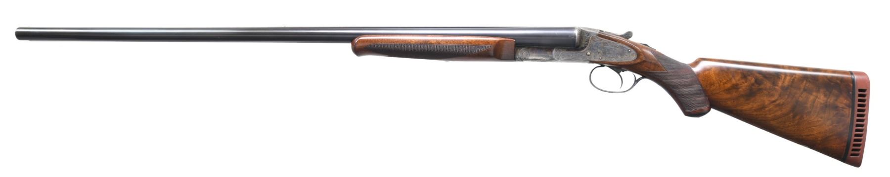 SHOTGUN. Cal. 12 ga. 3". S# RE97917. Bbls. 32" of Nitro Steel. White front & mid beads. Bottom of bbl. lug is marked "LONG RANGE". Case colored sidelock action w/ specialty grade engraving. Right lockplate features a waterfowl scene w/ flying mallard. Left lockplate upland scene shows two quail. Balance of receiver has foliate engraving & straight line borders that extend to the trigger guard, forearm iron & breech end of bbls. Hunter one SST. Selective ejectors. Schnable tipped beavertail forearm & horn capped pistol grip stock of fancy black walnut. German silver presentation plate in toeline is engraved "J / SANDS / W". LOP: 14" over Hawkins pad. DAC: 1 3/4". DAH: 2 1/2". Stock has approx. 1/8" cast off. WEIGHT: 8 lbs, 7.6 oz. Bore diameter: RT .727, LT .727. Choke constriction: RT .040, LT .040. Minimum wall thickness: RT .036, LT .037. Mfg. 1927. CONDITION: over 95% lightly faded bbl. blue showing edge wear on rib. Action has 70% lightly faded case colors w/ silvering in carry areas. Stocks have very good refinish w/ lightly freshened checkering. Tight action, top lever sits slightly right of center. Very good bright bores. (25-732/DS). CURIO. $3,000-4,000.