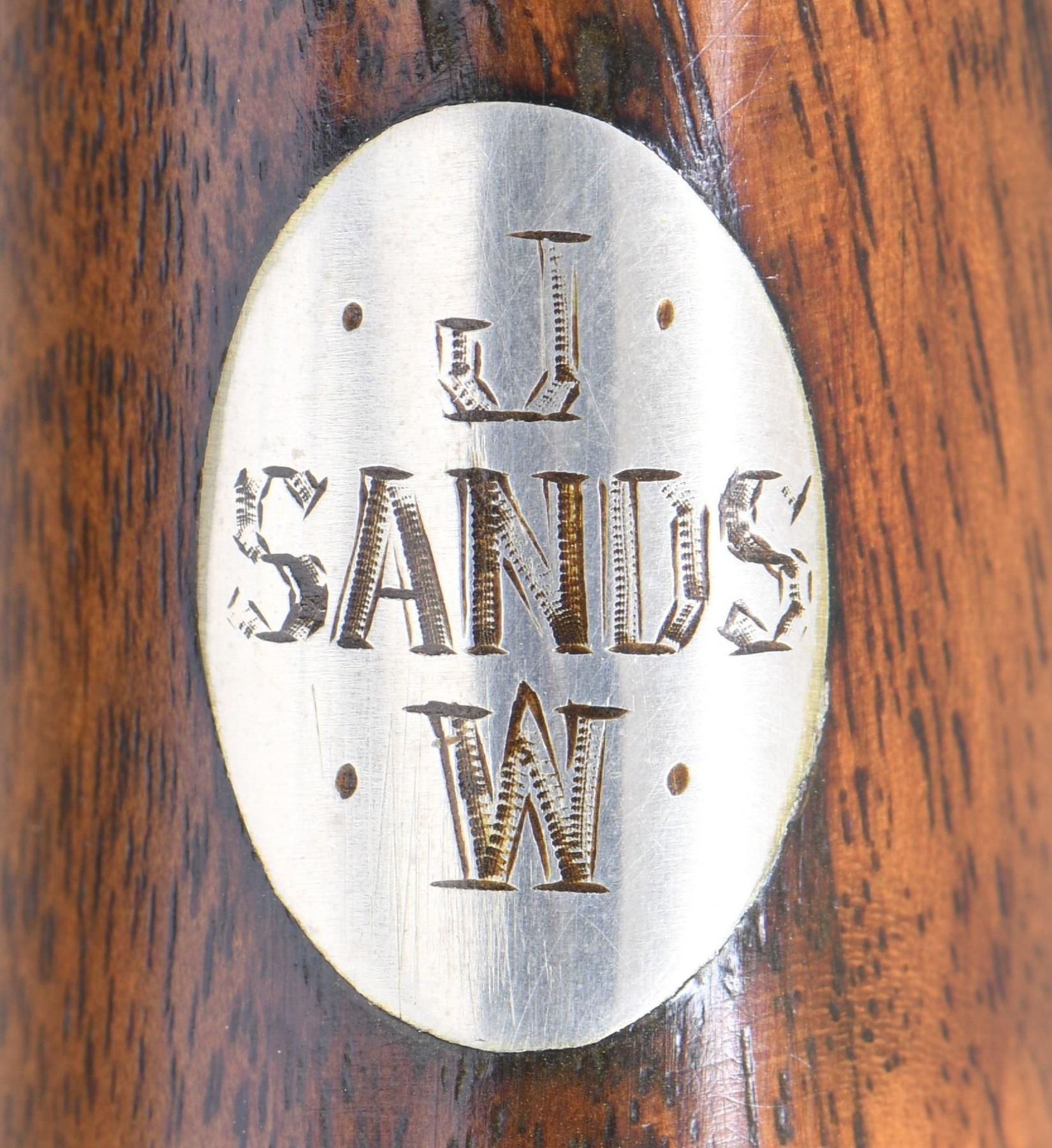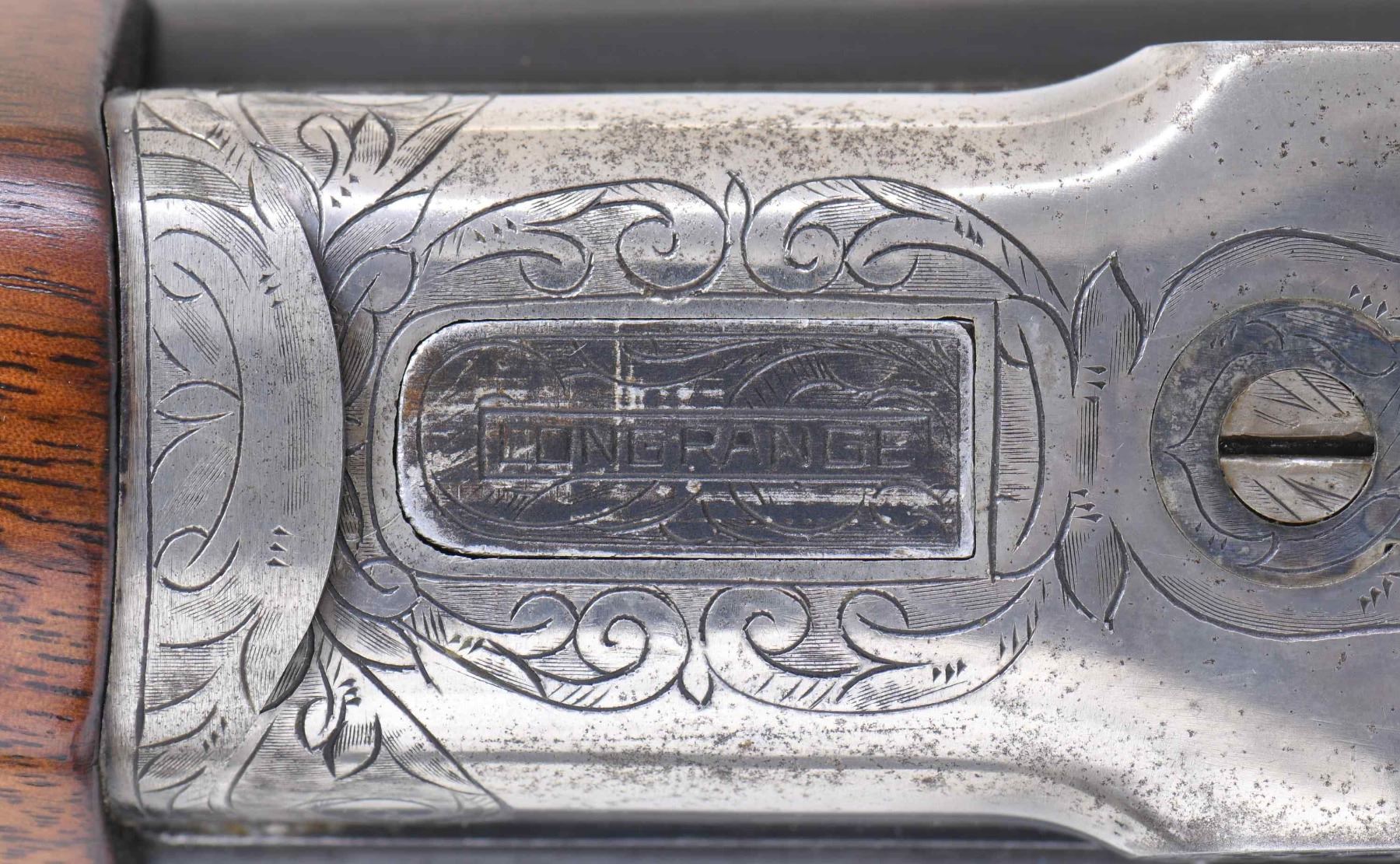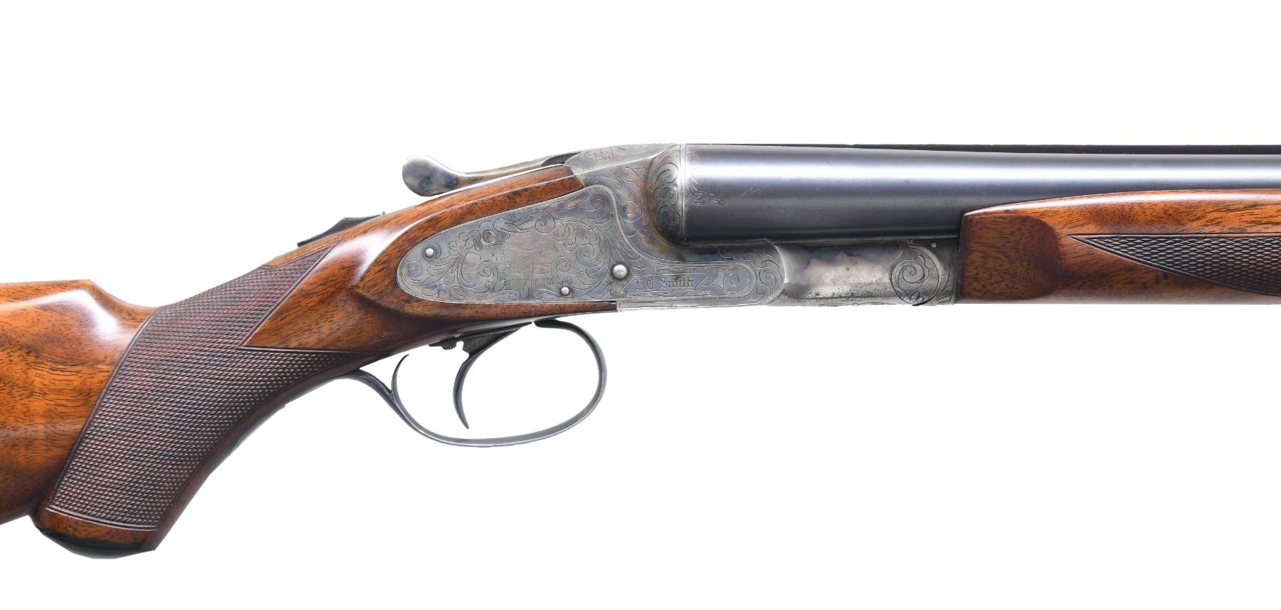 SHOTGUN. Cal. 12 ga. 3". S# RE97917. Bbls. 32" of Nitro Steel. White front & mid beads. Bottom of bbl. lug is marked "LONG RANGE". Case colored sidelock action w/ specialty grade engraving. Right lockplate features a waterfowl scene w/ flying mallard. Left lockplate upland scene shows two quail. Balance of receiver has foliate engraving & straight line borders that extend to the trigger guard, forearm iron & breech end of bbls. Hunter one SST. Selective ejectors. Schnable tipped beavertail forearm & horn capped pistol grip stock of fancy black walnut. German silver presentation plate in toeline is engraved "J / SANDS / W". LOP: 14" over Hawkins pad. DAC: 1 3/4". DAH: 2 1/2". Stock has approx. 1/8" cast off. WEIGHT: 8 lbs, 7.6 oz. Bore diameter: RT .727, LT .727. Choke constriction: RT .040, LT .040. Minimum wall thickness: RT .036, LT .037. Mfg. 1927. CONDITION: over 95% lightly faded bbl. blue showing edge wear on rib. Action has 70% lightly faded case colors w/ silvering in carry areas. Stocks have very good refinish w/ lightly freshened checkering. Tight action, top lever sits slightly right of center. Very good bright bores. (25-732/DS). CURIO. $3,000-4,000.