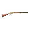 Cal. 44 Henry RF. S# 121449. Louis Daniel Nimschke (July 1832-April 9, 1904) was a German born immigrant who is considered one of the leading firearms engravers of his time. This elegant rifle has American style engraving consisting of flowing foliate scroll w/ punch dot backgrounds on receiver sides. Right side has open banner for personalization. Left side depicts a running bull elk. Complimenting engraving extends to receiver, top & bottom as well as forearm cap & brass crescent trap door buttplate. Bottom of frame has typical “LDN” signature. Bbl. 24” octagon w/ 2 line King’s-Improvement address. German silver blade rocky mountain style front sight w/ graduated leaf rear sight. Walnut forearm & straight grip stock w. sling swivels. Left inside of lower tang is stamped “R”. Top tang channel of stock is stamped w/ last four digits of S#. Lower tang bears inspection marks “F”, “S” & “R”. S# indicates 1874 mfg. CONDITION: brass shows a pleasing mild patina. Right sideplate has a slightly brighter appearance. Bbl. & mag. tube have a light gray brown appearance indicating touch up in the past. Sanded & refinished wood shows numerous scratches, marks & dark bruises. Stock has large chip missing left of lower tang. Forearm has full length repaired cracks along the center w/ added wood repair & long gouge on forward left side. Sound action. Bore retains sound rifling showing spotted light pitting. (01-22807/DS). ANTIQUE. $25,000-35,000.