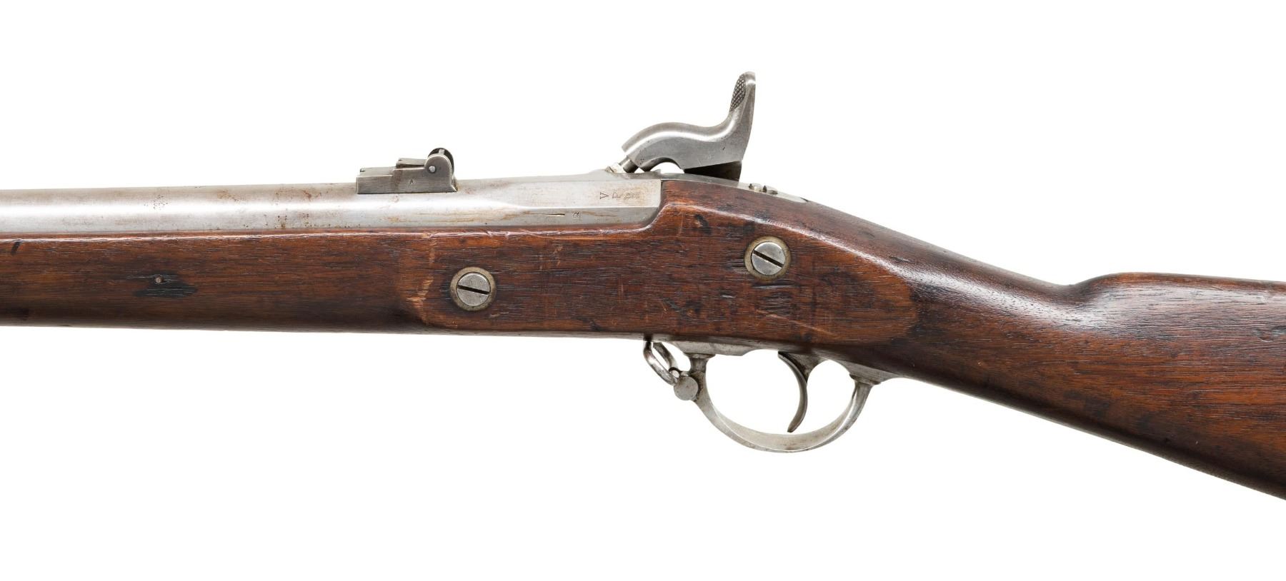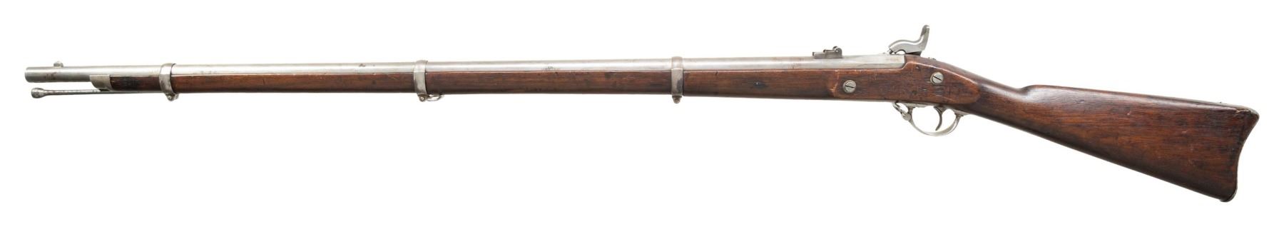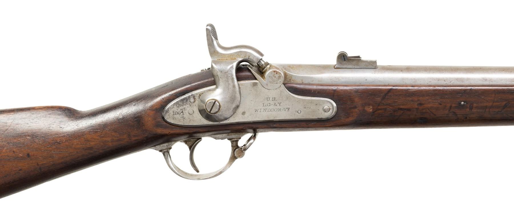 U.S. RIFLE MUSKET. Cal. 58. NSN. Bbl 40" rnd with oct shank. Fixed front sight with three leaf musket sight. Left flat is marked "V/P" over eagle's head. Top bbl flat and rear of flat have "1864" date. Forward portion of lock is stamped "U.S./L.G.-&Y./WINDSOR-Vt". Bbl bolster is marked with American eagle. Three band fastened walnut stock with iron fittings and proper ramrod. Total of 50,000 were mfg 1862-1864. CONDITION: cleaned metal shows scattered spots of light pitting. Heavily sanded stock shows numerous remaining marks and dents. Sound lock. Bore is generally bright with sound rifling. (01-28570/DS). ANTIQUE. $2,000-3,000.