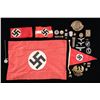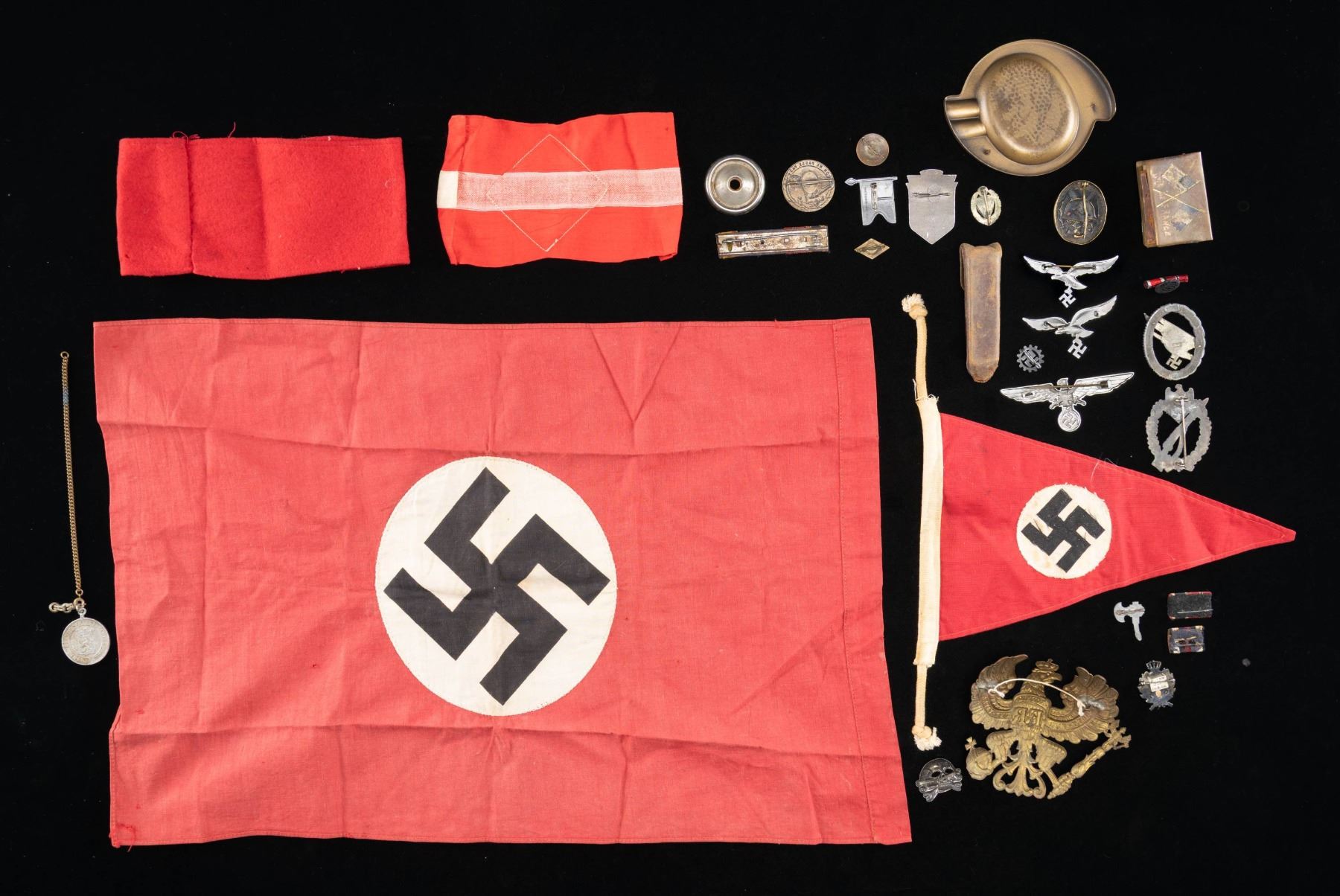 This extensive lot includes 1 Party pennant, 1 HJ armband, 1 wool Party armband, 1 small Party flag, 1 WWI Prussian spike helmet eagle in gilded brass, 1 WWI match safe, 1 brass WWI ashtray with bayonet decoration, 1 bone brush and comb set, 1 veteran's cap eagle, 1 Black Wound badge with finish loss, 2 Luftwaffe cap eagles, 1 Infantry Assault badge, 1 Paratrooper badge "G.H. DSANG DRESDEN" WITH NO PIN OR CATCH, 1 5 award ribbon bar, 3 small ribbon bars, 9 tinnies and small pins, 1 Party pin, 1 HJ membership pin, and 1 SS deaths head with 2 flat attachment pins. CONDITION: all items generally show light wear unless noted above. (02-25338/BF). NON-GUN. $400-700.
