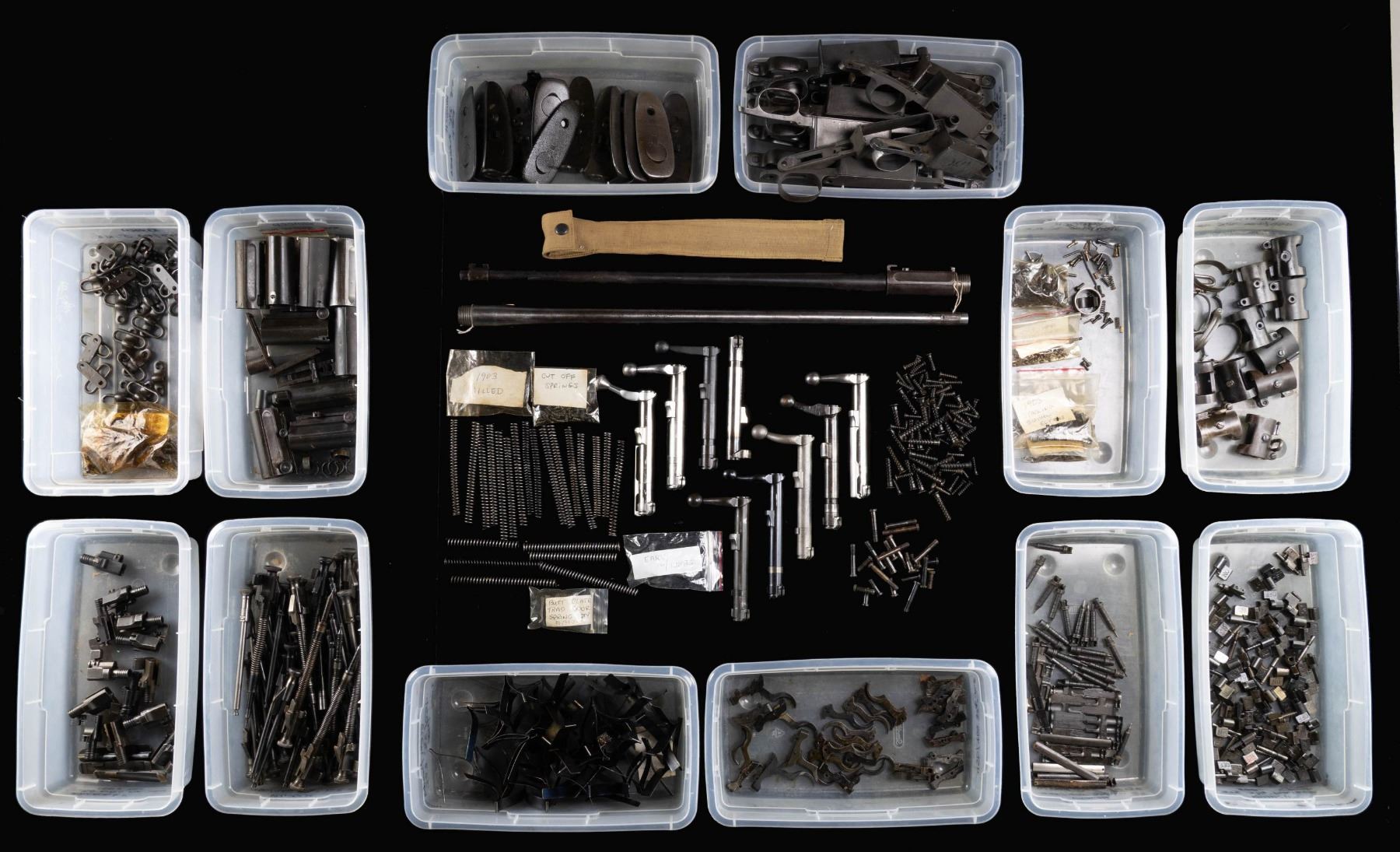 Metal components for 1903's (possible 03-A3 inclusion) that are all in good serviceable condition (some better) with some specific conditions listed. Amounts are counted with slight possible errors along with some amounts being approximate estimates. 9 stripped bolts (4 original, 5 altered). / 14 triggerguard - floorplate combo's plus 4 stripped triggerguards. / 6 striker-firing pin assemblies with shrouds. / 1 striker-firing pin assembly with shroud for Model 1922 M2. / 5 headless strikers as used for National Match or sporters. / 29 standard strikers. / 22 firing pins. / 13 shrouds (2 missing safeties). / 3 milled followers. / 32 follower springs. / 21 extractors. / 22 striker springs (various lengths). / 13 refinished buttplates of various original conditions to include pitting. / 11 triggers. / 11 sears. / 6 trigger - sear sets. / 1 Pedersen trigger - sear set. / 19 buttstock swivels with bases plus 1 bare base. / 8 stacking swivels. / 5 swivel bands (1 with swivel). / 7 upper bands with bayonet lugs plus 3 more with stacking swivels. / 65 cut offs, over 25 spindles plus misc. related parts. / 1 SA 5-11 dated barrel with finish and sight bases. Even light pitting and wear in bore. / 1 SA 6-26 dated barrel with no finish or sight bases. Even light to moderate pitting and wear in bore. / 14 rear sight slides. / 3 rear sight collars with sights. / 6 collars without sights. / 2 rear sights. / 1 front sight cover. / 2 front sight bands; 1 has sight assembly. / over 50 ejectors. / many screws for wood, trigger guards, stacking swivels and cut offs. / pack of trap door buttplate springs. / 12 milled band locks. / cut off springs. / trigger springs. / 1 very good "R. H. LONG, 8-13" marked canvas snap closing canvas pouch for cleaning rod of Marbles style; wood handle with brass rod plus 2 more brass rods, tip and bore brush. / misc. small parts. (02-24590-36/NW). $1,000-2,000.