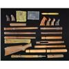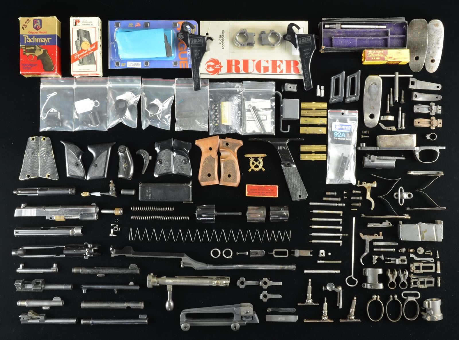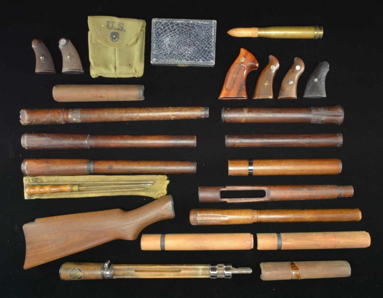 Miscellaneous military rifle parts; Mostly bands, sights, 2 trigger guards, 2 buttplates, etc. / 7 misc. hand guards of which 2 appear for Springfield & 1 for 1917 Enfield. / Front portion of Mauser K98 style rifle forend appearing to be working teaching aid having Simson & Co. plaque w/ German writing. / 2 very good Garand forends w/ metal. / 2 unfinished Garand hand guards w/ retaining clips. / 1 near excellent Garand hand guard w/ gloss finished retaining clip. / Rubon 1943 dated dbl. M1 carbine mag. pouch. / Vintage 3 piece Marble’s cleaning rod in poor condition cloth bag; no tips. GRIPS: Manhurin checkered black plastic style PPK-S grips. / Pachmayr boxed GM 45. / Pachmayr boxed TC-G. / S& W original 3rd. gen. 4500 & 1000 series grip. / Checkered black synthetic grips w/ lg. chip appearing for HSc. / Stippled hardwood grips w/ RH thumbrest possibly for Beretta Model 92. / S& W checkered K frame Goncalo Alves target grips w/ speed loader cut out. / Very good S& W diamond center checkered walnut Magna K frame grips. / S& W diamond center checkered walnut K frame grips made without medallions. / S& W diamond center checkered walnut N frame service grips w/ lg. silver medallions. / Walnut grips w/ carved starburst pattern emanating from grip screw; appearing for early S& W K frame (service style). / Ruger Security 6 square butt checkered walnut grips. / Early S& W checkered hard rubber grips. / Franzite reproduction Radom grips. / Pachmayr black grip adapter. / NPC checkered alloy left grip for Model 1911 style pistol incorporating over the bore Weaver style base. / 2 scope blocks wider than Unertl style. / New carded Ruger Model 77 target gray scope rings; KD-71HTG. / Contender Lobo scope base. / 3 Lyman No. 1 second variation tang sights; 2 marked P (Stevens Ideal) and 1 marked R (Remington Model 3; all cal. except 22). / Lyman 1A for Savage Model 99. / Lyman No. 48 long slide only graduated to 125. / Rare boxed Ideal sight micrometer. / 3 S& W cylinders; K frame in 38 S& W, N frame with ejector assembly in 45 long Colt plus K frame with patina in 38 Special. / AR-15 carry handle with sights for flat top upper. / Highly polished operating rod appears for M-14. / Bolt assembly for Type 38 Arisaka. / 3 Luger takedown tools (no proofs); one numbered .2858 plus one with broken screwdriver tip. / Smith & Wesson bulged 4" Victory bbl. / S& W, M& P 6" blued bbl. with light oxidation and near excellent bore. / Complete Beretta Model 92 SB slide assembly w/ bbl. / Stripped Mauser Model HSc slide. / Mauser 6.35 stripped slide plus bbl. with fair bore. / Mauser 1914 style bbl. with grooved rib at top front portion & near excellent bore. / Colt 6" Officer's Model bbl. with target style front base missing blade and screws; light bulge near front. / 2 S& W ejector rods one blued and one nickel. / Stripped P38 bbl. w/ eagle 88 proof; also marked B42 but no serial number; near excellent bore. / Mauser Model 1934 style bbl. of 177 cal. with 3 cartridges utilizing boxer primer and pellet. / Black Walther PPK mag. extension. / 2 Mannlicher 8X56R stripper clips. / Rock Island Arsenal 1915 expert rifleman's badge w/ portion of original box marked E 730 32. / 5 Luger sub caliber conversion kits, 4 of which marked Walther; 2 use adapter cartridges and 3 use direct sub caliber cartridges. / Complete original Colt Ace slide assembly with 2 springs and spring guides having stacked fiber washers of 3/4" and 1/2". Holster like finish loss and some light oxidation predominately on left side at bottom, forward of cocking grooves. Very good bore. (02-16948-2/NW). $1,200-1,800.
