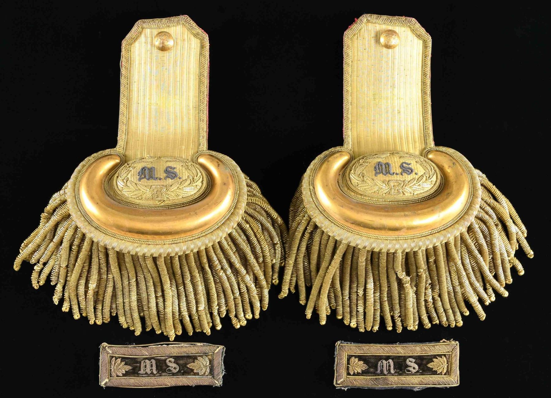 7. Fine pair of Medical staff shoulder straps, embroidered bullion "MS" and major’s insignia on black velvet as was regulation. Good to very good overall, backings gone and some bullion strands loose. (02-24315/JS). NON-GUN. $4,000-6,000.