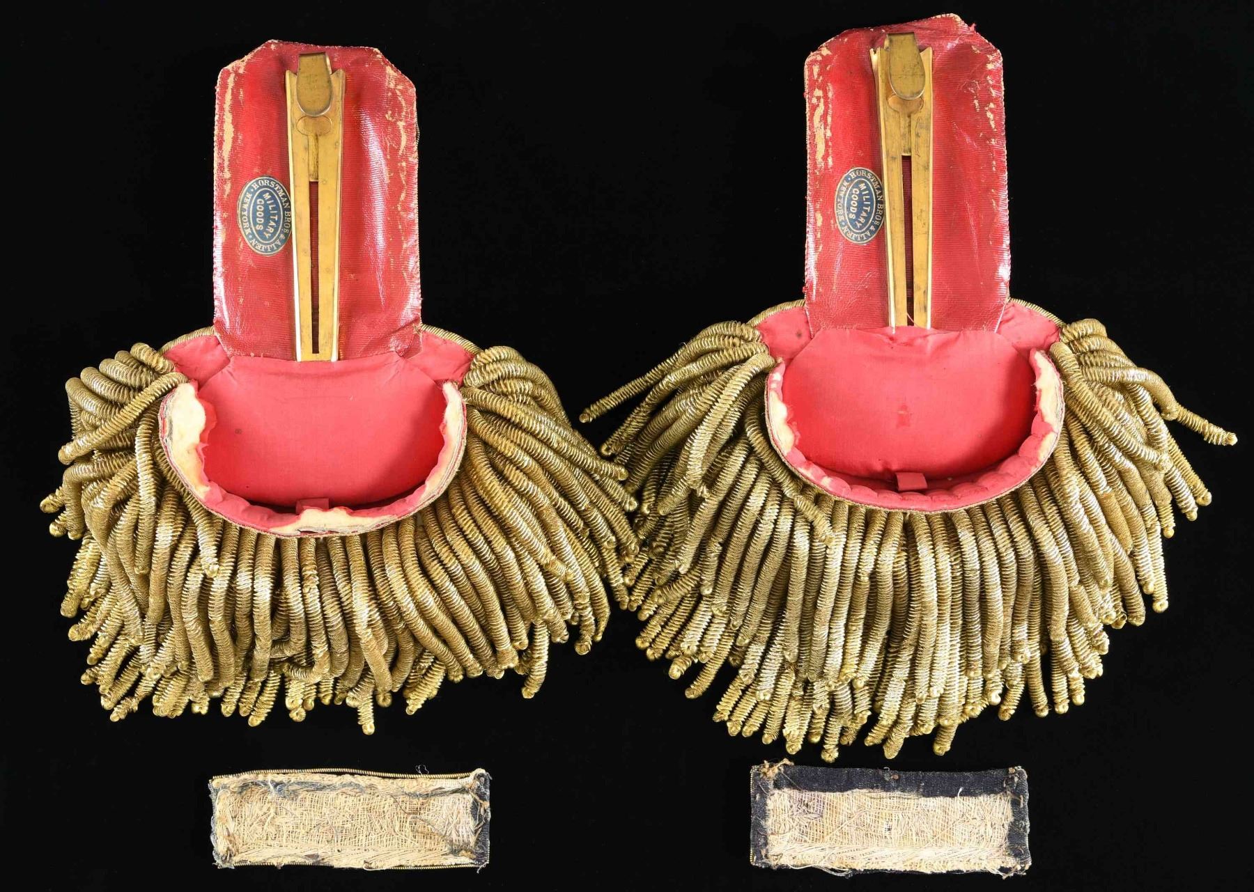 6. Fine pair of Medical Staff epaulets, "MS" insignia embroidered with bullion wreaths, Horstmann Bros. & Allien makers label. Fine overall, rank insignia removed.