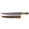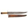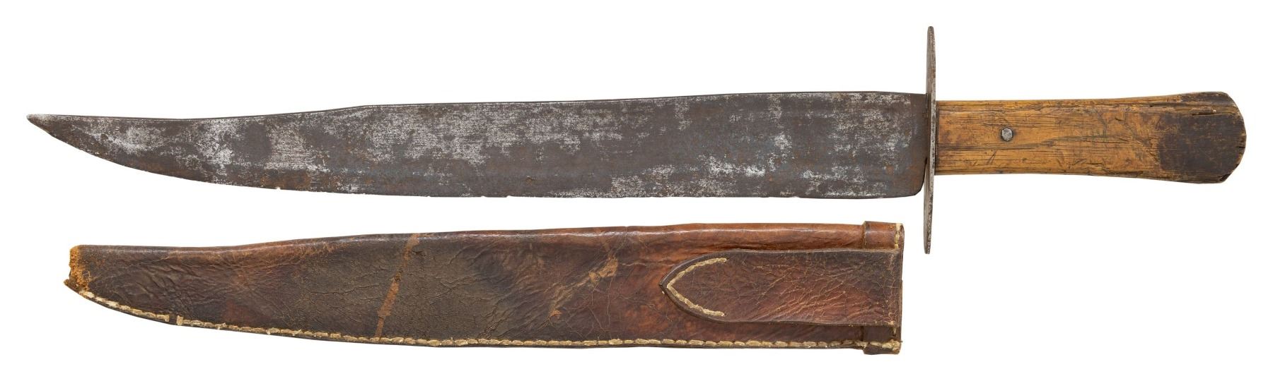 19.5" overall, 14.5" clip point blade, long tapered 4.5" clip, 1.75" wide, pinned coffin shaped wood handle, 3.5" iron cross guard, well fit brown leather sheath with sewn belt loop. CONDITION: very good overall, "as found", iron patina, forging flaws, pitting. Sheath is sound with missing tip. PROVENANCE: Bob Alispones estate collection. (02-26042/JS). NON-GUN. $1,500-2,000.