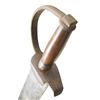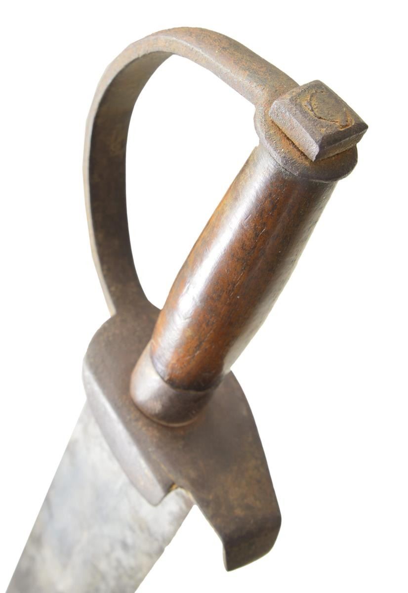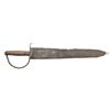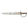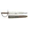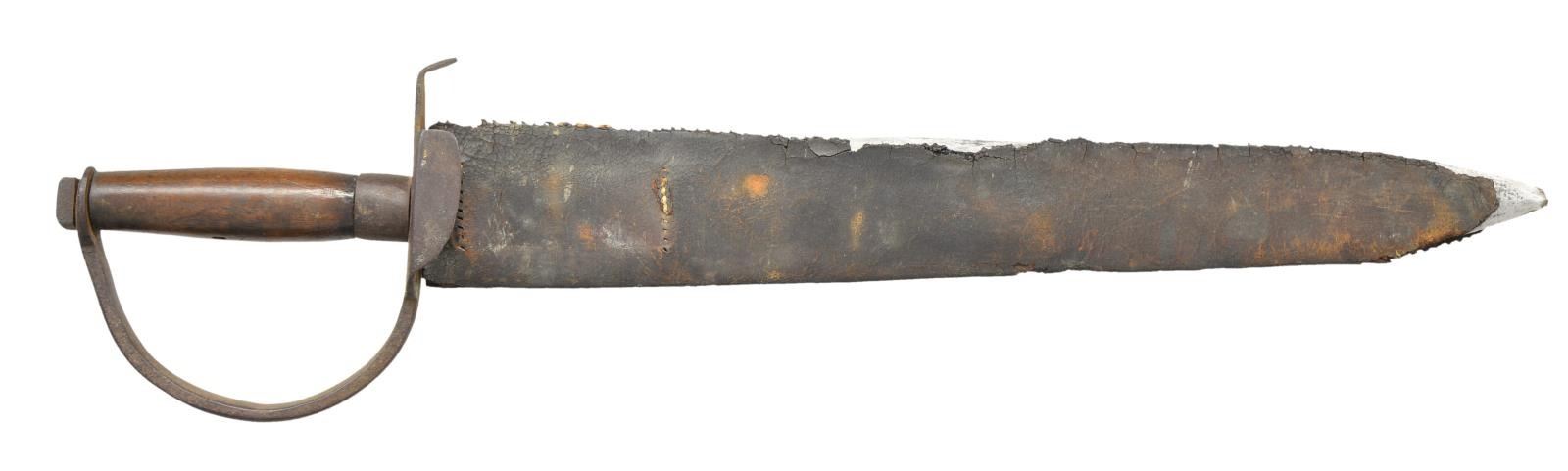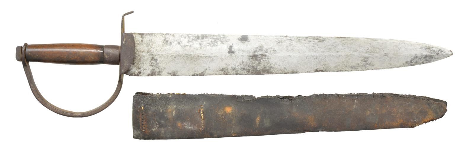 21.25” overall, 16.5” double edged spearpoint blade, 2.5” wide. Cross guard has folded languet, thick heavy “D” knuckle bow that terminates at pommel held by a nut, a small wood grip with iron ferrule. original leather scabbard was sewed at edge with sewn belt loop which is missing. CONDITION: knife is very good overall, gray blade with the original toolmarks, staining & light pitting. Sheath is poor but protected blade since the war, unsewn open seams, belt loop missing, dry, chipped, but mostly intact. PROVENANCE: Pictured on page 186 “Accoutrements IV” by Jim Johnston. (02-18175/JS). $2,000-3,000.