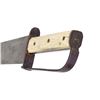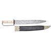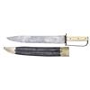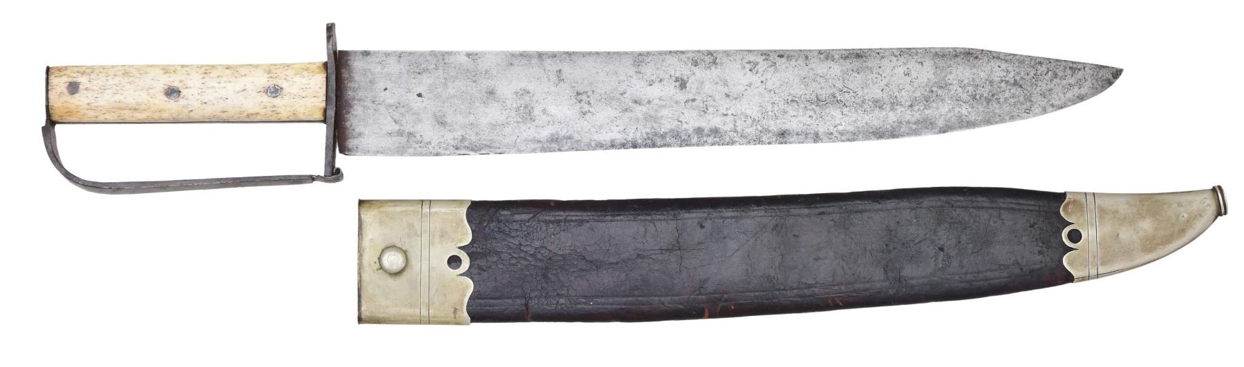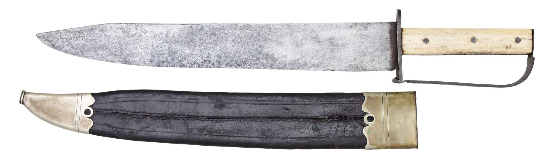 SHEATH. Overall length: 20 1/4". Blade length: 13 7/8". Plain, massive, nearly 2" wide blade has a 2 3/4" false edge at the clipped point. The iron D-guard hilt was made by attaching the knuckle bow to the crossguard by peening over a round pin extending from the end of the crossguard. The pommel cap is formed by the end of the knuckle bow. The knife has a 2-piece bone grip secured by three iron pins on either side. Leather scabbard with coin silver throat and tip. The bottom edge of the throat and top edge of the tip have an undulating edge and a pierced circle in the center of each side. The throat has a frog stud button, and the extreme tip has what appears to be two stacked ovoid disks as a finial. Sheath body has tooled linear decoration and a stitched center seam. CONDITION: blade has a medium gray mottled patina. Hilt has a general dark patina. Bone grips have acquired a pleasing cream color and show minimal age cracks. Silver mounts on the sheath have a few tiny dents and have acquired a pleasing tarnish. Sheath body shows the usual scuffs and scrapes but remains remarkably solid and shows no major damage. (02-22978/BF). $3,000-4,500.
