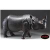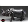 RHINOCEROS. This spectacular, monumental carving of a rhinoceros appears to be executed in ironwood and was likely carved in Africa by an indigenous sculptor. It measures approx. 35" x 18 1/2" at the shoulder. The horn rises 6 1/2" from the animal's snout. The rhino's toenails are highlighted in white, and the eyes appear to be carved bone. The rhino is true to form but quite folky in appearance. The exceptional weight of this sculpture leads us to believe the media is ironwood. The animal's skin texture, ears, horn, and obvious maleness are well executed and readily apparent. CONDITION: the sculpture is solid, although there is a notable drying crack on the left side of the animal's head and under its chin. There is another crack on the right side about at the haunches. There are also two short drying cracks on the left midsection of the beast. PROVENANCE: from the renowned collection of quality sporting arms from Lewis Drake together with inventory of Lewis Drake Associates. (02-23549/BF). $1,000-2,000.