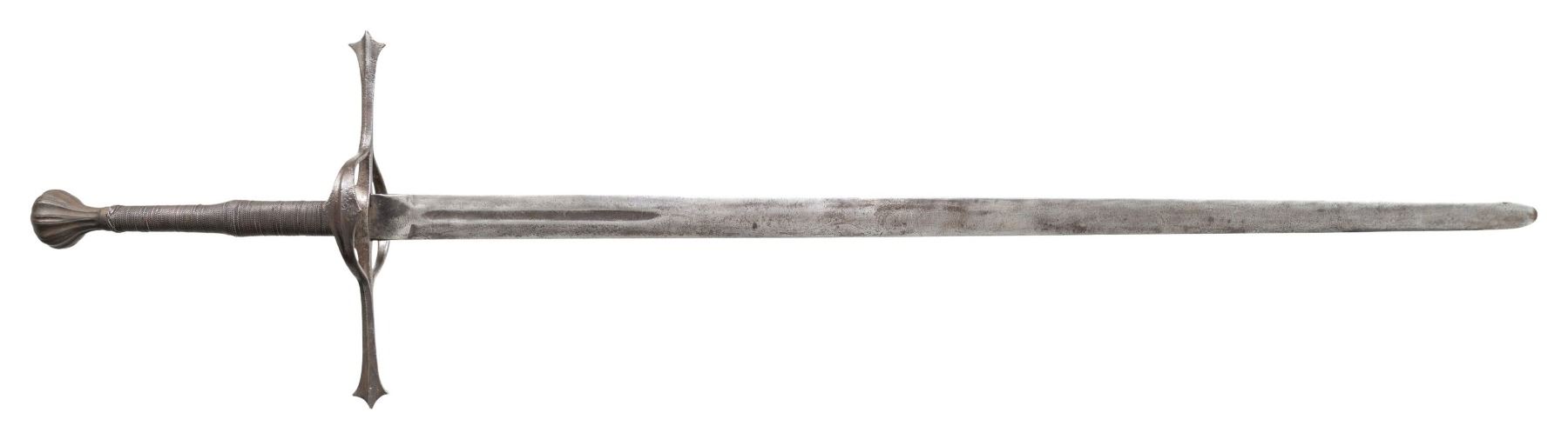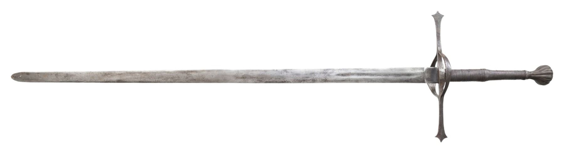 This massive two handed broadsword measures in at 50" overall with a 39.5" blade. The blade has a 7.5" fuller that begins 1" from the ricasso and is flanked with partially visible engraved designs. The straight crossguard has has flattened ducks foot quillion tips and a raised central rib on the outer edge. The crossguard branches into double side rings with the outer ring having a raised central riv and central diamond flare. The swelled grip is wire wrapped with turkish knots and terminated with a fluted scent stopper pommel. CONDITION: Metal surfaces have a cleaned grey mottled patina. PROVENANCE: Estate Collection of Nicholas Apergis. (02-24720/ZAL) $2000-3000