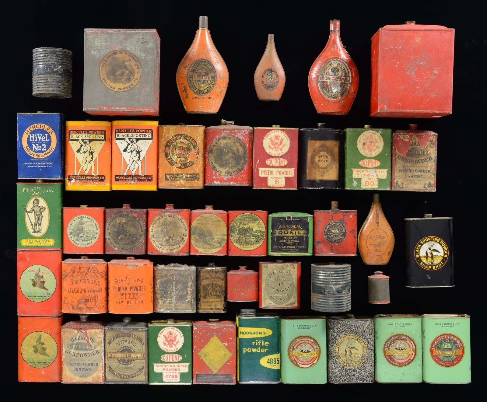 This collection of cans has a variety of types & sizes, many are quite scarce & early. Manufacturers on the cans include, but are not limited to, Hazard Powder Company, American Powder Mills, Laflin & Rand Powder Company, Eureka Powder Works, The Dittmar Powder Manufacturing Company, Schuetzen Smokeless Dupont, and California Powder Works. There are many other names in this fine group of 43 powder cans. Please see photos for exact type, form, and condition. CONDITION: the majority of these cans have full labels with the remaining examples having most of their labels. All show some degree of wear, but none are crushed or heavily damaged. All but two have their original cap/spout. PROVENANCE: From the Lifelong Collection of Glen E. Mattox. (02-18721-2/BF). $1,200-1,800.