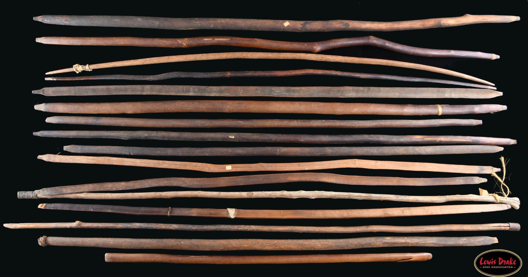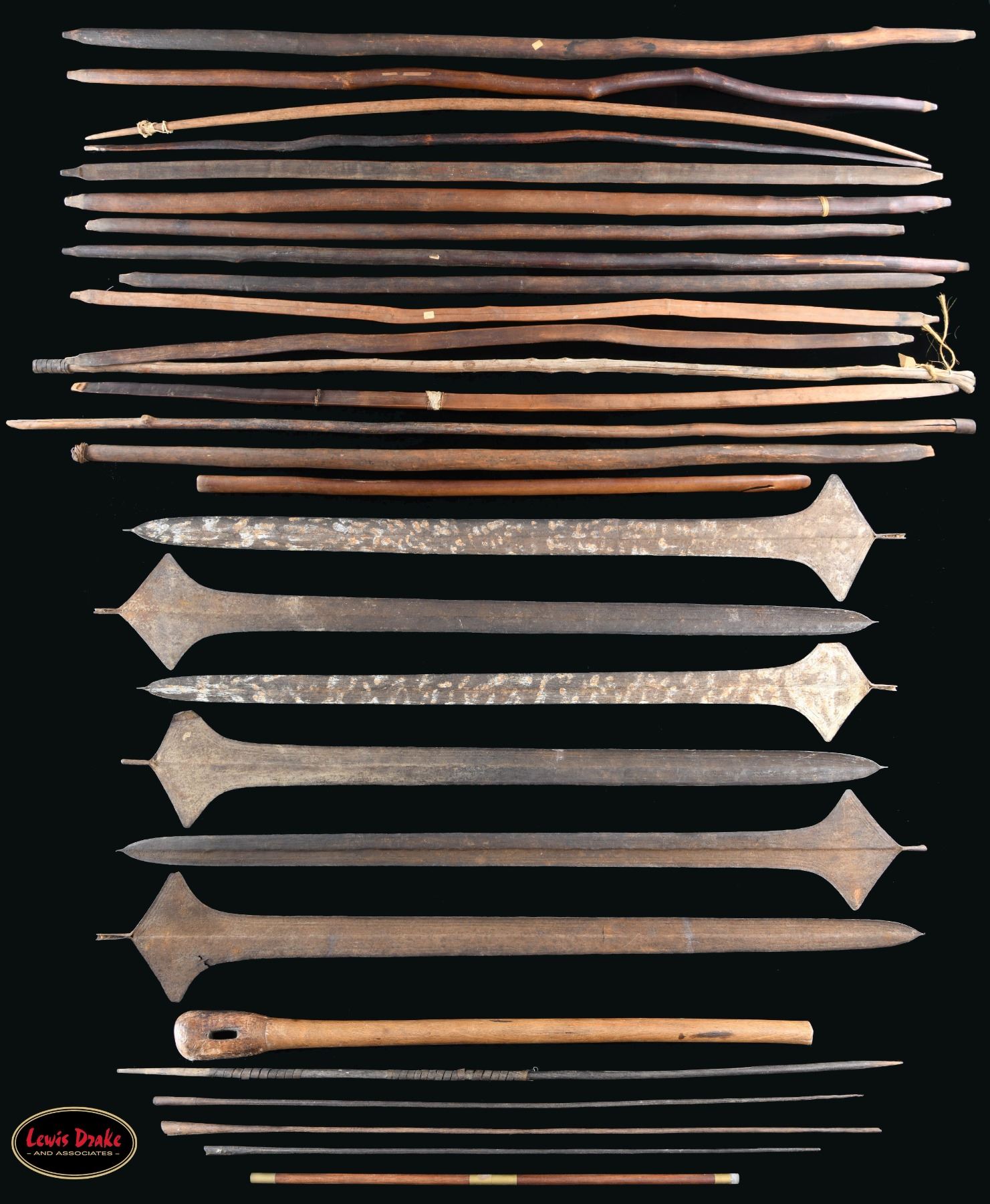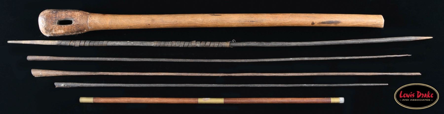 MORE. This large lot consists of 14 carved wooden bows of African origin. None of the bows have strings remaining but all seem to be complete. The lot further includes 12 hand-forged long spear points measuring roughly 58" overall. All of the points seem hurriedly forged and do not show fine details. Also included are 7 wooden poles and metal pole heads with 1 axe handle. CONDITION: all of these items are made by the indigenous people of Africa and were likely used by them prior to being collected by Lewis Drake. All items show average use wear along with some storage wear. No major damage is noted. PROVENANCE: from the renowned collection of quality sporting arms from Lewis Drake together with inventory of Lewis Drake Associates. (02-23563-7/BF). $600-900.