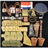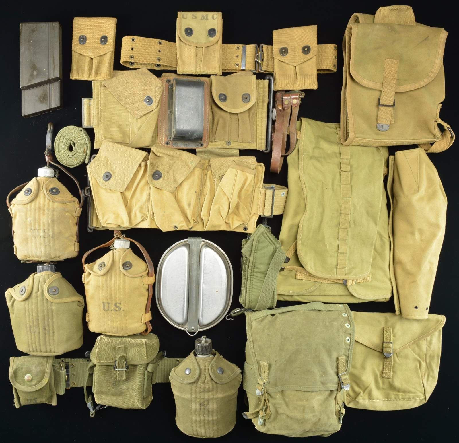 This large group includes 1 green cotton canvas Marine Corps 10 pocket cartridge belt with interlocking buckle dated 1945. / 1 WWI USMC 2 pocket 45 Cal. clip pouch dated 1918. / 1 Tan cotton canvas 9 pocket cartridge belt with subdued rimless button closures and interlocking buckle. / 1 Green cotton canvas 6 pocket cartridge belt missing female buckle. / 1 Tan cotton canvas 10 pocket cartridge belt with snap closures and interlocking buckle by Russel dated 1916. / 1 Tan cotton canvas equipment belt with matching 45 Cal. clip pouch dated 1918 and russet leather sword hanger. / 1 Tan cotton canvas 45 Cal. clip pouch dated 1918. / 1 Green cotton canvas clip pouch dated 1943. / 1 Pair of goggles in a brown full leather pouch. / 1 Tan cotton canvas full length rifle sleeve with carrying strap likely for an 03 Springfield. / 1 Russet leather holster for a 45 Cal. automatic pistol. / 1 Black leather holster for a 45 Cal. automatic pistol. / 2 BAR clips. / 1 Modern nylon British flag. / 1 Black & gold bullion British Naval aiguilette. / 1 Tan canvas action cover marked “L.C.C. & CO., 6-18”. / 1 Light green cotton canvas backpack with all straps intact marked “BAKER LOCKWOOD MFG. CO. INC. 1941”. / 1 Light green cotton canvas pouch. / 1 Green cotton canvas equipment backstrap set. / 1 BAR tan cotton canvas cartridge belt with 4 large pockets and 1 pocket for two 45 Cal. auto clips. Belt also has metal cup intact and is marked on the reverse “L.C.C. & CO., 10-18 RIFLEMAN’S RIGHT” & “LEFT” on other side. / 1 BAR tan cotton canvas cartridge belt with 4 large pockets and 1 pocket for two 45 Cal. auto clips. Belt also has metal cup intact and is marked on the reverse “P.B. & CO. RIFLEMAN’S RIGHT” & “....LEFT BROWNING COLT 5-1918” on other side. / 1 Pair of russet leather cuff covers marked “GRAY HORSE T 1899”. / 1 Green cotton canvas pouch with a clip on carrying strap. / 1 Private purchase russet leather “Sam Brown” belt with 45 Cal. clip pouch, over the shoulder strap, and chain saber hanger. / 1 Military rifle sling for an 03 Springfield. / 1 Black leather private purchase waist belt. / 1 Leather canteen sling. / 1 English tan canvas holster dated 1925. / 1 Green cotton canvas strap. / 1 Steel mess kit with utensils. / 2 Aluminum canteens with tan cotton canvas & leather covers. / 1 Aluminum canteen with a green cotton canvas cover dated 1944. / 1 Green cotton web equipment belt with canteen & cover dated 1956. Belt also includes a first aid kit in pouch and a miscellaneous pouch. / 1 West German visor cap. / 1 WWII 2nd class iron cross in rough condition with no suspension ring or ribbon. CONDITION: all items show light wear and appear fully serviceable except as noted. (02-17951/BF). $900-1,300.