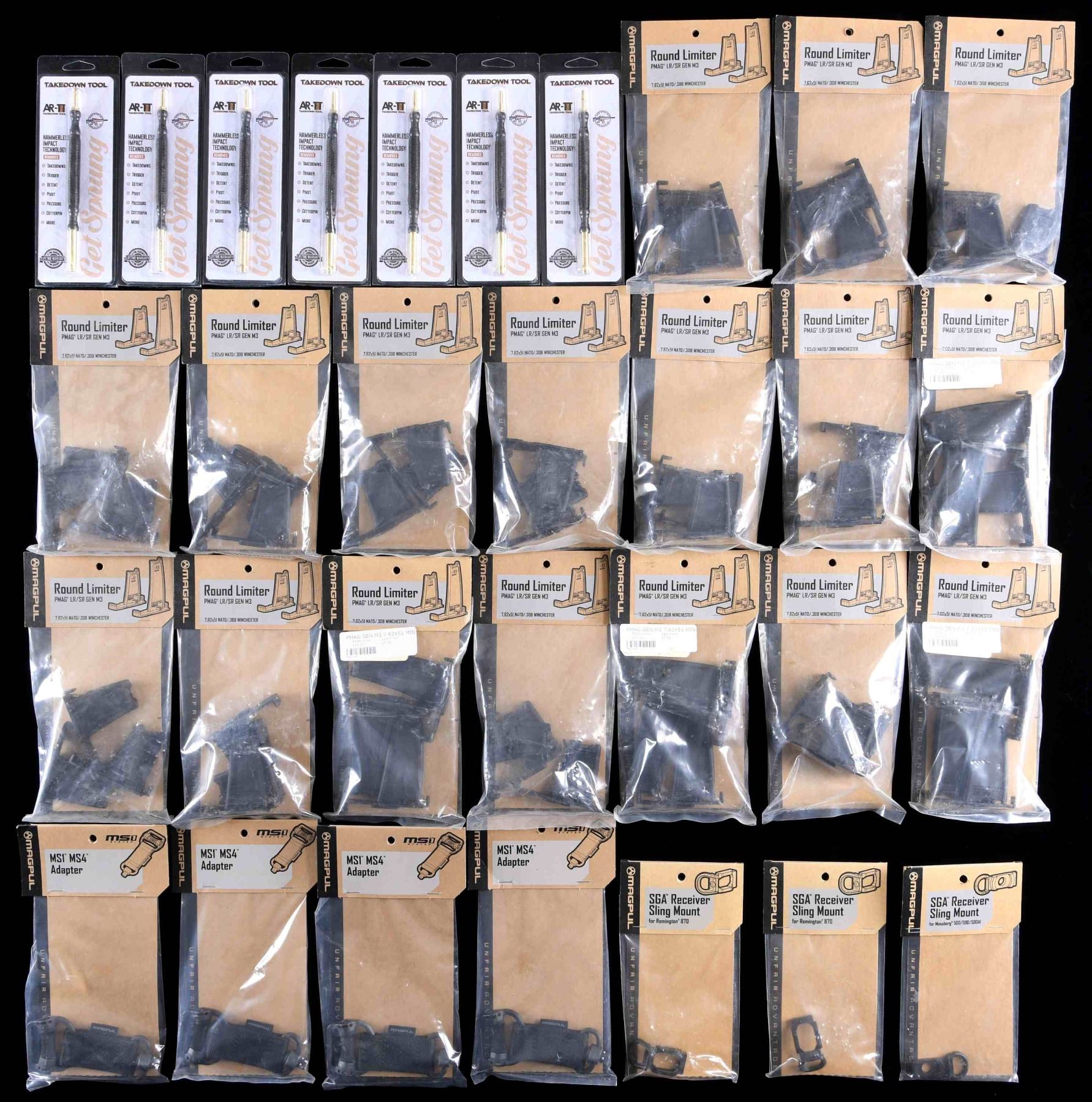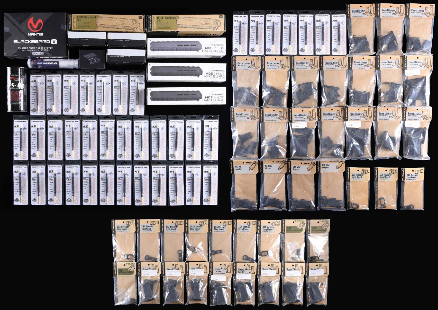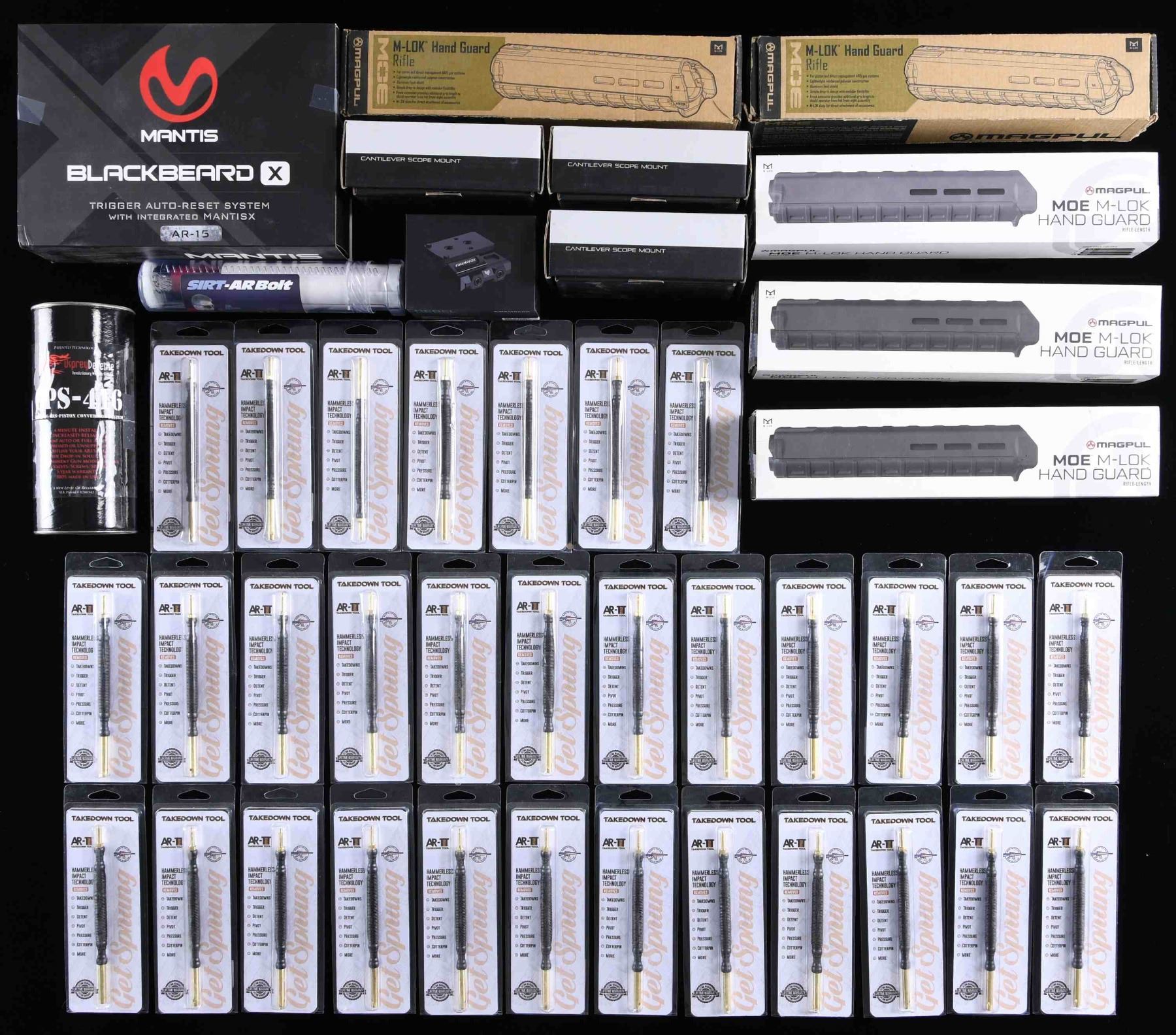 All items in new or excellent condition. Counts carefully done but there may be an occasional numerical error. Some items are for .308 styles, but most are for 5.56 / 223 styles. Mixed listed as to parts or accessories; some groups by brand. MAGPUL: 17 PMAG LR/SR GEN M3 AR44 Round Limiter. / 8 PMAG LR/SR GEN M# 7.62X51 Round Limiter. / 4 MS1 MS4 Adapters. / 3 MSA Adapters. / 5 SGA Receiver Sling Mounts for Remington Model 870. / 5 SGA Receiver Sling Mounts for Mossberg Model 500 or 590. / 5 M_LOK Rifle Length Handguards. / MISC: 38 AR-TT AR Takedown Tools. / 1 OspreyDefense OPS 416 AR Gas-Piston Conversion Unit for Carbines of 11.5" to 16" barrel lengths (complete kit with bolt carrier). / 1 Rebel Riser Mount for plate mounted reflex sights. / 3 AIM 1" Cantilever 1.75" high scope mounts. / 1 Mantis Blackbeard X AR-15 Trigger Auto-Reset System with integrated MantisX Training Aid. / 1 SIRT-AR BOLT Next Level Training Aid. (02-23802-1/NW). $1,000-2,000.