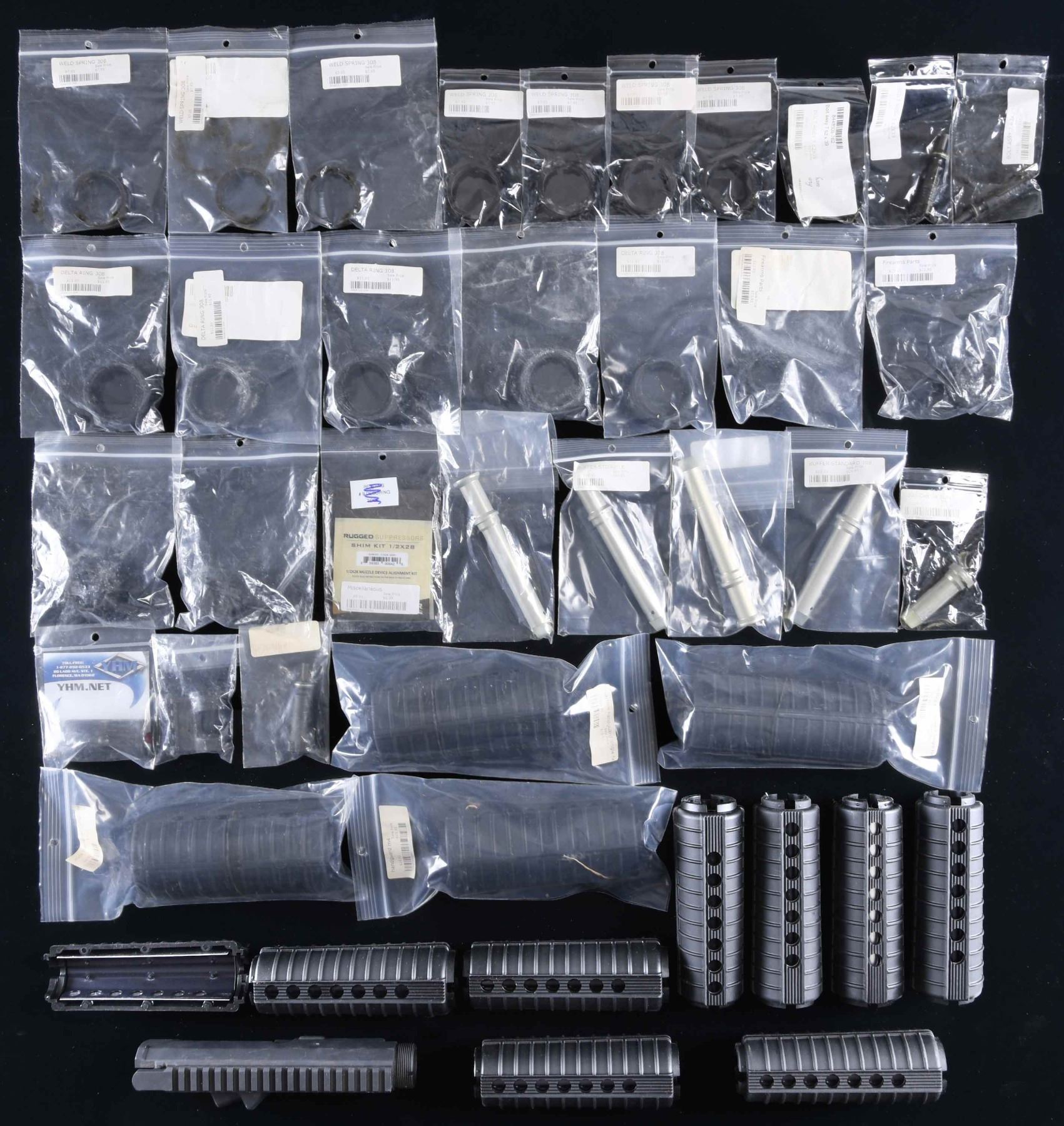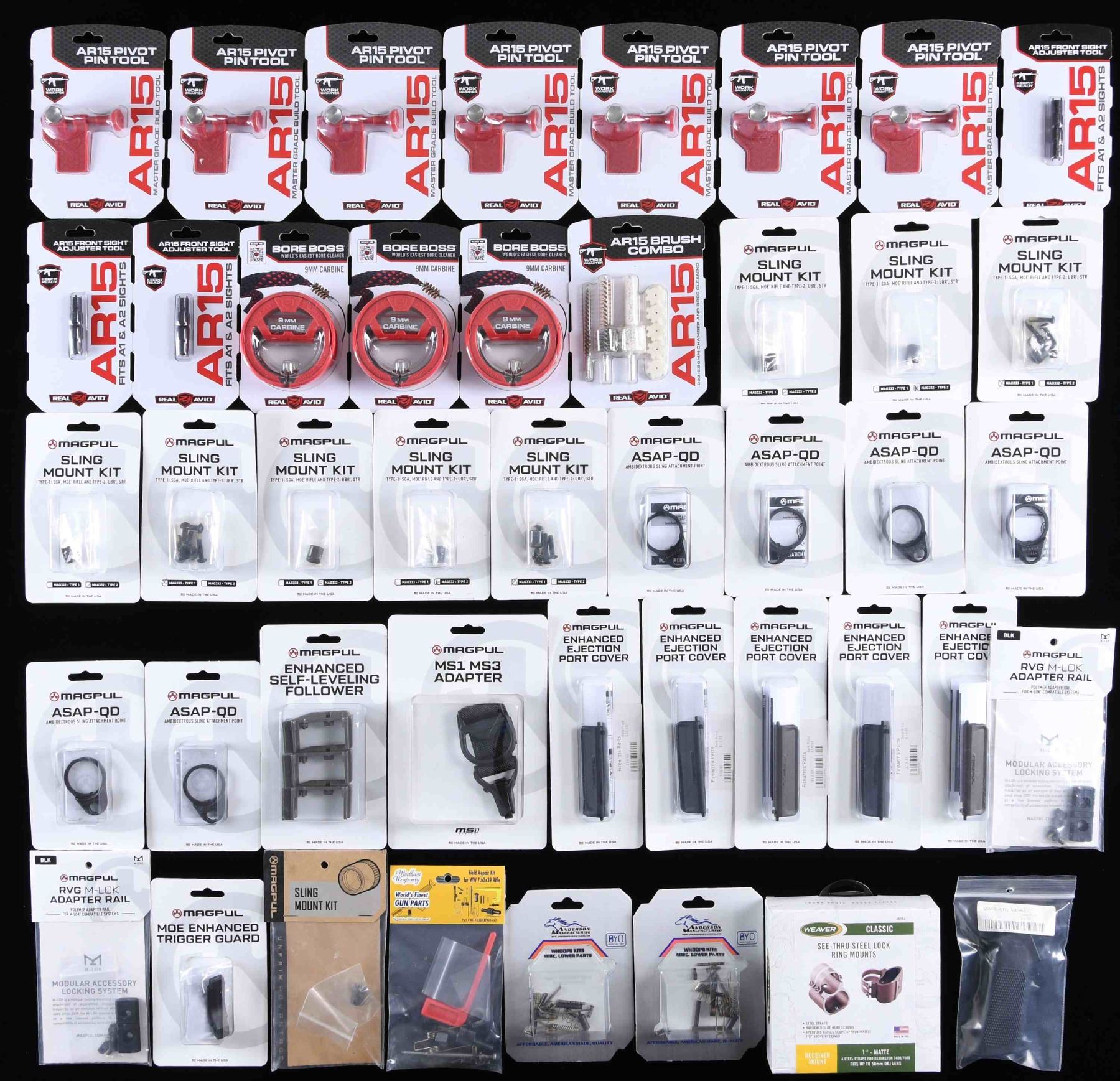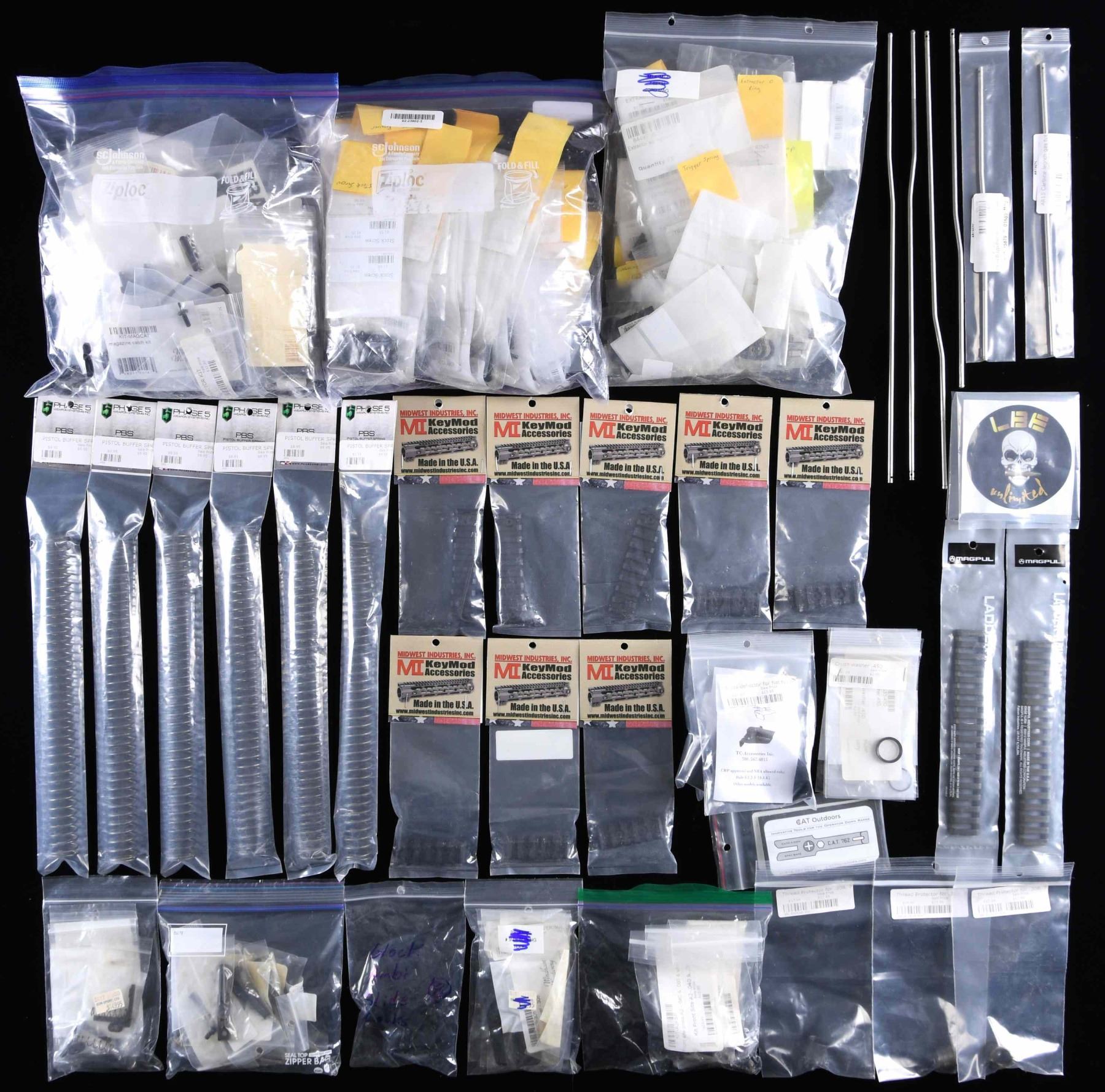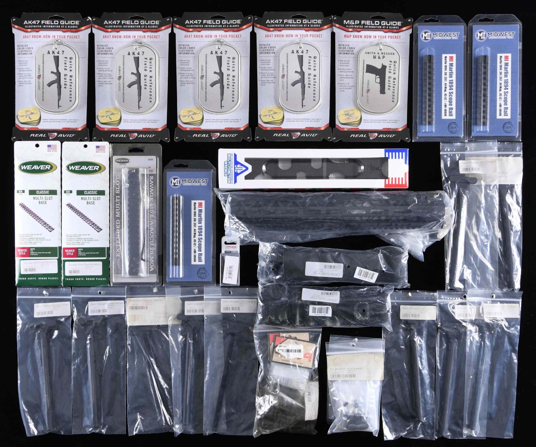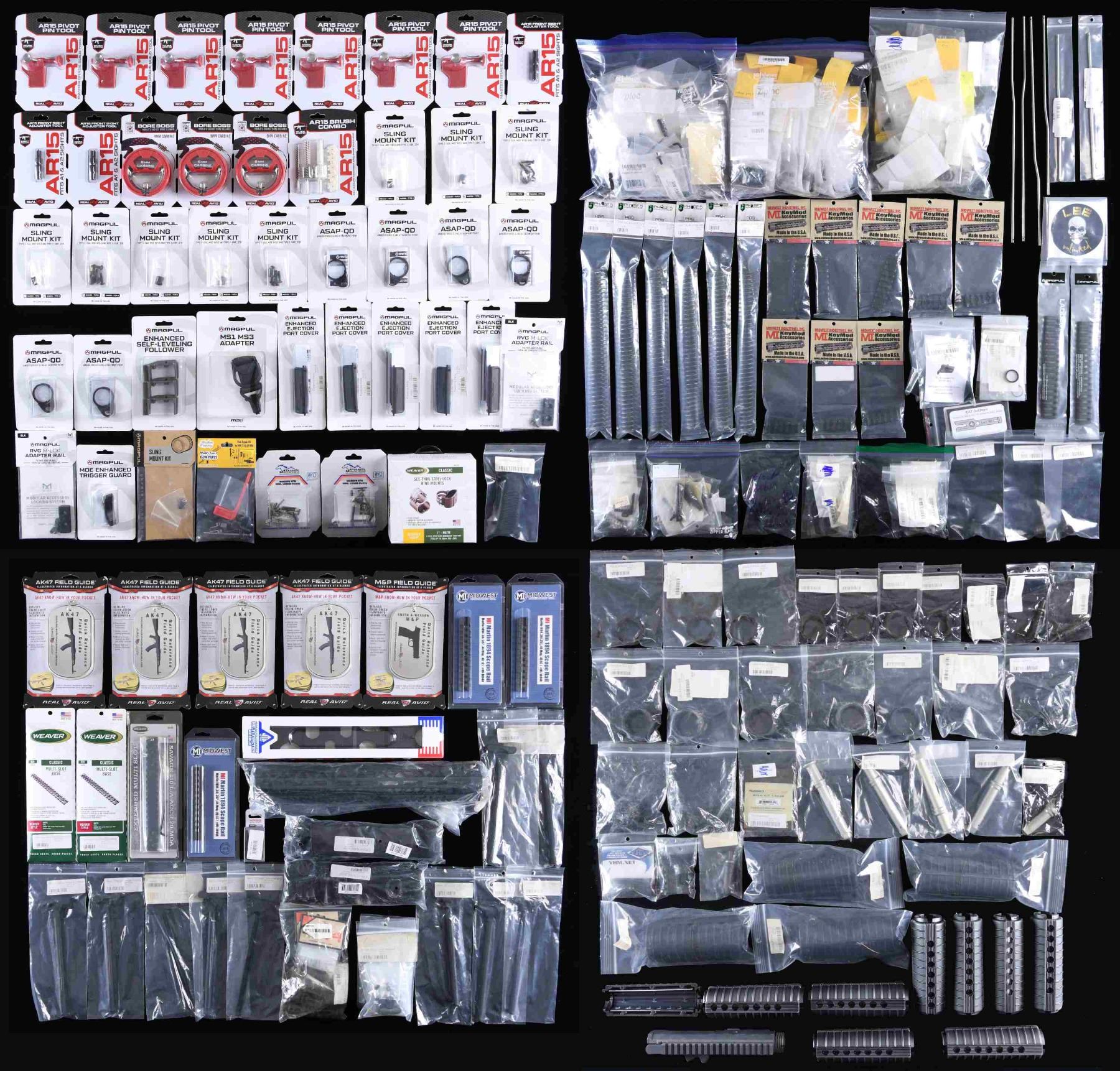 All items in new or excellent condition. Counts carefully done but there may be an occasional numerical error. Some items are for .308 styles, but most are for 5.56 / 223 styles. Mixed listed as to parts or accessories; some groups by brand. MAGPUL: 5 Enhanced Ejection Port Covers. / 3 Type 1 Sling Mount Kits. / 6 Type 2 Sling Mount Kits. / 6 ASAP-QD Ambi Sling Attachments. / 1 MS1 MS3 Adapter. / 1 MOE Enhanced Trigger Guard. / 1 pack Enhanced Self-Leveling Followers. / 2 RVG M-LOK Adapter Rails. / 2 Ladder Rail Panels. / REAL AVID: 7 AR15 Pivot Point Tools. / 3 Bore Boss 9mm CARB bore snakes. / 3 AR15 Front Sight Adjuster Tools. / 1 AR15 Brush Combo. / 4 AK-47 Field Guides. / 1 S&W M&P Field Guide. / MIDWEST INDUSTRIES: 5 KeyMod 2.125" Rails. / 3 KeyMod 3.75" Rails. / 3 Marlin 1894 Scope Rails. / WEAVER: Savage Model 110LA 20 MOA base. / 2 Savage Axis Multi-Slot bases. / 1 See-Thru 1" Matte Ring Set. MISC: 3 AR Bolts in 7.62X39. / 1 AR Bolt in 7.62X51 Nato. / 3 Thread Protectors in 308. / 12 Bolt Gas Key Kits. / 5 A-2 Front Site Kits w/ tool. / 7 Cage Style Flash Hiders. / 5 Port covers for 308. / 4 Magazine latches. / 1 Kriss Steel Flip Front Sight. / 1 YHM Bi-Pod Rail Adapter. / 1 CAT Outdoors Carbon Scraper. / 5 Shim kits. / 7 Crush washers. / 3 Brass deflectors. / 2 FIELD 223 head space gauges. / 2 Picatinny gas blocks with stud & swivel. / 1 Picatinny gas block. / 2 Black Nylon 2 point slings. / 1 WW 308 MLOK 15" Handguard. / 6 Phase5 PBS pistol buffer springs. / 3 Standard rifle gas tubes. / 2 Carbine gas tubes. / 1 Mid length gas tube. / 3 A2 Pistol grips. / 1 Hogue pistol grip. / 5 "BLEM" marked stripped 308 charging handles. / 3 complete "BLEM" marked 308 charging handles. / 2 Windham Weaponry charging handles. / 3 Standard AR rifle buffers. / 1 Standard 308 rifle buffer. / 1 Carbine 308 buffer. / 4 Barrel nuts for 308. / 5 Delta Rings. / 6 WELD 308 Delta ring springs. / 12 sets of Carbine handguards plus 1. / 1 UTG Multi-Function AR Wrench. / 1 Stripped AR upper receiver with Picatinny rail. / 2 Anderson Whoops Lower Parts Kits. / 1 Windham Weaponry Field Repair Kit for WW 7.62X39, 3 large Zip Lok bags with additional parts, pins, etc. too numerous and insignificant to list. (02-23802-2/NW). $1,000-2,000.
