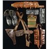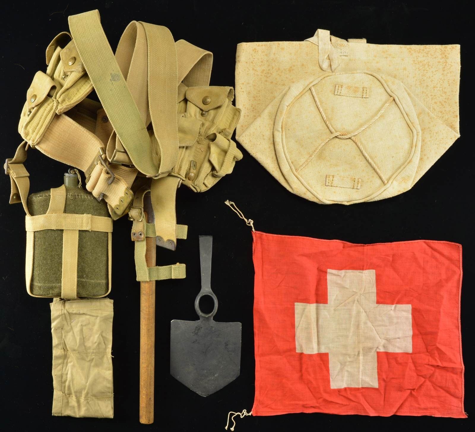 This group includes: 1 pair of black leather military boots likely British. / 1 Small Swiss flag. / 1 Swiss military flashlight. / 1 Swedish M1896 Mauser 5-pocket ammo belt. / 1 Cotton canvas feed bucket. / 1 Black leather ammo pouch with 4 pockets. / 1 Large pony fur backpack with ridged sides. / 2 Light green canvas backpacks. / 1 Brown blanket with a single red stripe. / 1 Swiss Schmidt Rubin 6-pocket ammo belt. / 1 Black leather 3-pocket ammo pouch. / 1 “Sam Brown” style brown leather officers belt with saber hanger over the shoulder strap, ammo pouch, and pistol holder. / 1 Entrenching shovel & pick combination marked “E. ELWELL LTD 1918”. / 1 Blue enamel canteen with green wool covering and brown leather carrying straps. / 1 Khaki cotton enlisted belt with canteen, 2 separate 3-pocket clip pouches, and 2 separate 2-pocket clip pouches, a bayonet frog, and a frog containing a wooden belt axe handle. / 1 Khaki cotton 5-pocket clip bandolier marked “MK. II J.S.G. 7-18”. CONDITION: all items show light to moderate wear and appear complete. (02-16424/BF). $400-600.