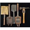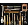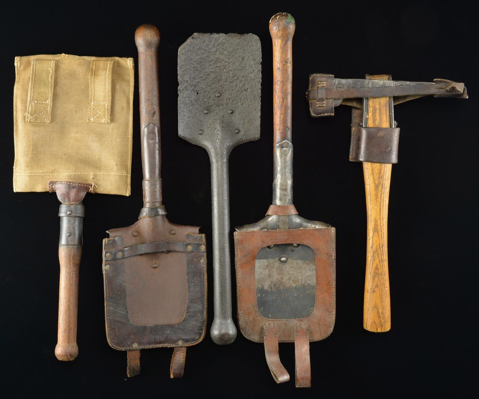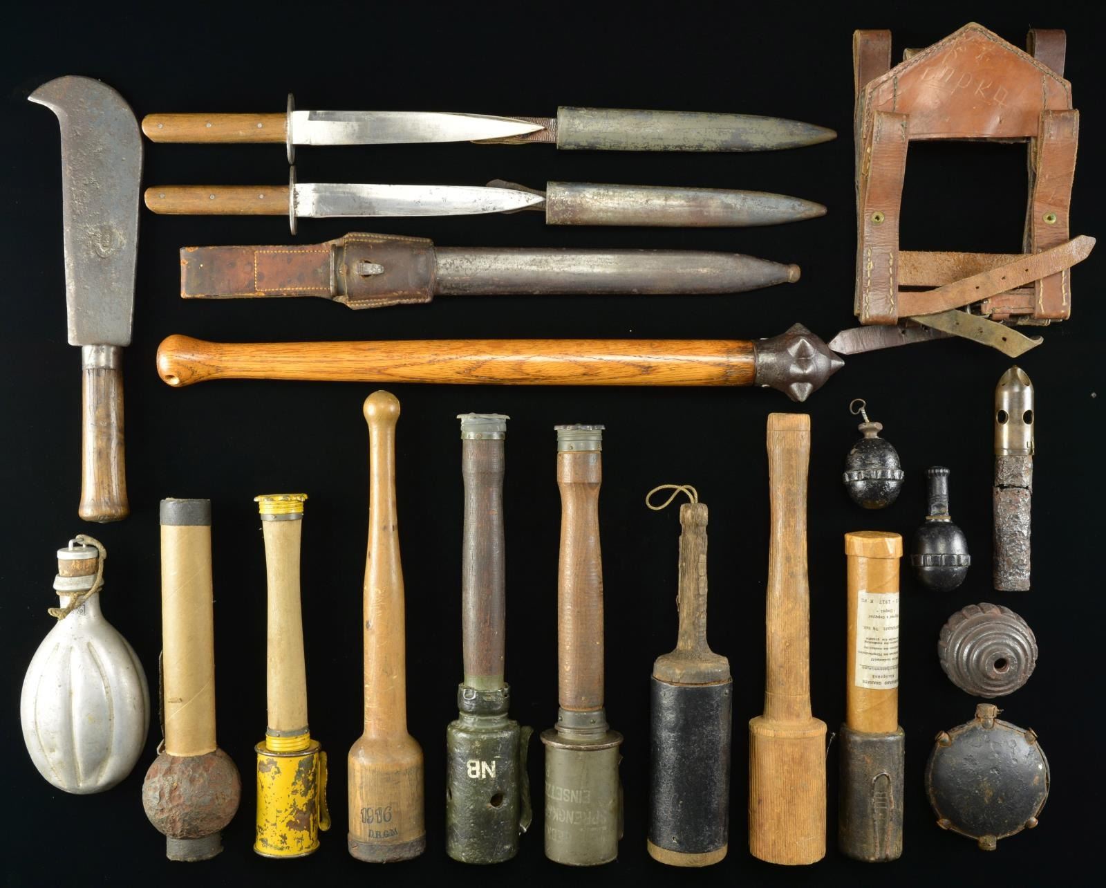 This varied group includes 2 WWI Austrian trench knives with original sheaths. / 1 Aluminum Austro-Hungarian canteen with stopper. / 1 German bayonet scabbard and frog. Scabbard measures 15 1/4". / 1 Fascine knife dated 1916. / 1 Austro-Hungarian entrenching shovel with khaki canvas carrier. / 1 Excavated German entrenching shovel found in Belgium. / 2 German entrenching shovels with leather sheaths and attached belt loops. / 3 German entrenching shovel leather sheaths. / 1 Turned wooden practice grenade with iron top dated 1916. / 1 Turned wood practice grenade. / 1 German M1915 kugel grenade excavated in Poland. / 1 German WWII disk grenade. / 1 German rohrhand hand grenade dated 1917. / 1 Homemade iron & wood hand grenade. / 1 Austro-Hungarian Rohr grenade in excavated condition. / 1 German stick grenade with yellow painted can. / 2 German stick grenades marked “VOR GEBRAUCH SPRENGKAPSEL EINSETZEN F.A.B.” / 1 German stick grenade with heavy iron head marked “NB”. / 1 Austro-Hungarian excavated rifle grenade. / 2 WWI German M1917 egg grenades. / 1 WWI German trench mace. Mace is 22” overall with heavy iron 9-pointed head. / 1 WWI German or Austrian trench axe with leather frog. CONDITION: excavated items have a dark, crusty, oxidized patina. Other items show light to moderate wear but appear substantially complete. (02-16421/BF) $800-1,100.