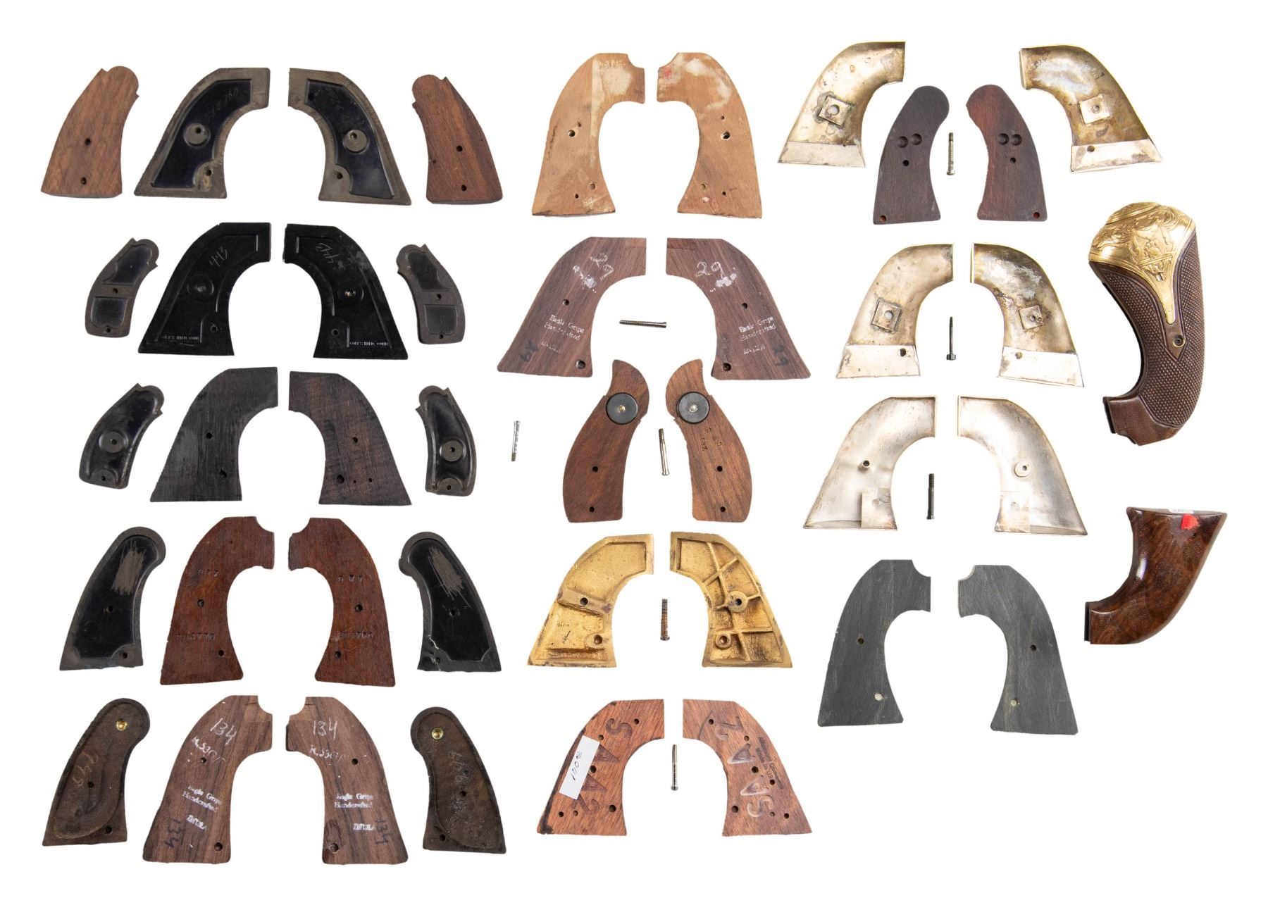 1) COLT SAA, original 1st gen. checkered hard rubber "Rampant Colt" logo, S# 348760. 2) COLT SAA, 2nd gen. hard rubber eagle & logo, marked "COLT'S HTFD HARTFORD". 3) COLT SAA, "10K" & "sterling" hallmarked Mexican made, Aztec insets. 4) COLT SAA, all metal, Mexican style engraved & inset Aztec medallions. 5) COLT SAA, all metal, Mexican style engraved, Mexican eagle inset medallions. 6) COLT SAA, checkered ebony, one side has vacant silver plaque. 7) COLT SAA, 1-piece fancy burl. 8) COLT SAA, checkered carved walnut, "Altamonte Company". 9) COLT SAA, heavy cast brass, raised eagle design. 10) COLT BISLEY, walnut, inset silver card suits, S# 284770. 11) COLT BISLEY, Faux pearl. 12) COLT BISLEY, checkered walnut, maker marked "eagle grips". 13) COLT BISLEY, custom light wood, brass butt caps. 14) 2 pair original COLT logo grips for later DA revolvers. 15) Pair of carved walnut grips and gilded cast relief buttcap, unknown early pistol. 16) 6 pair of misc. revolver grips, 2 with logos "S&W" & "F&W". CONDITION: very good overall, several have their screws. (02-25216/JS). NON-GUN. $1,000-1,500.