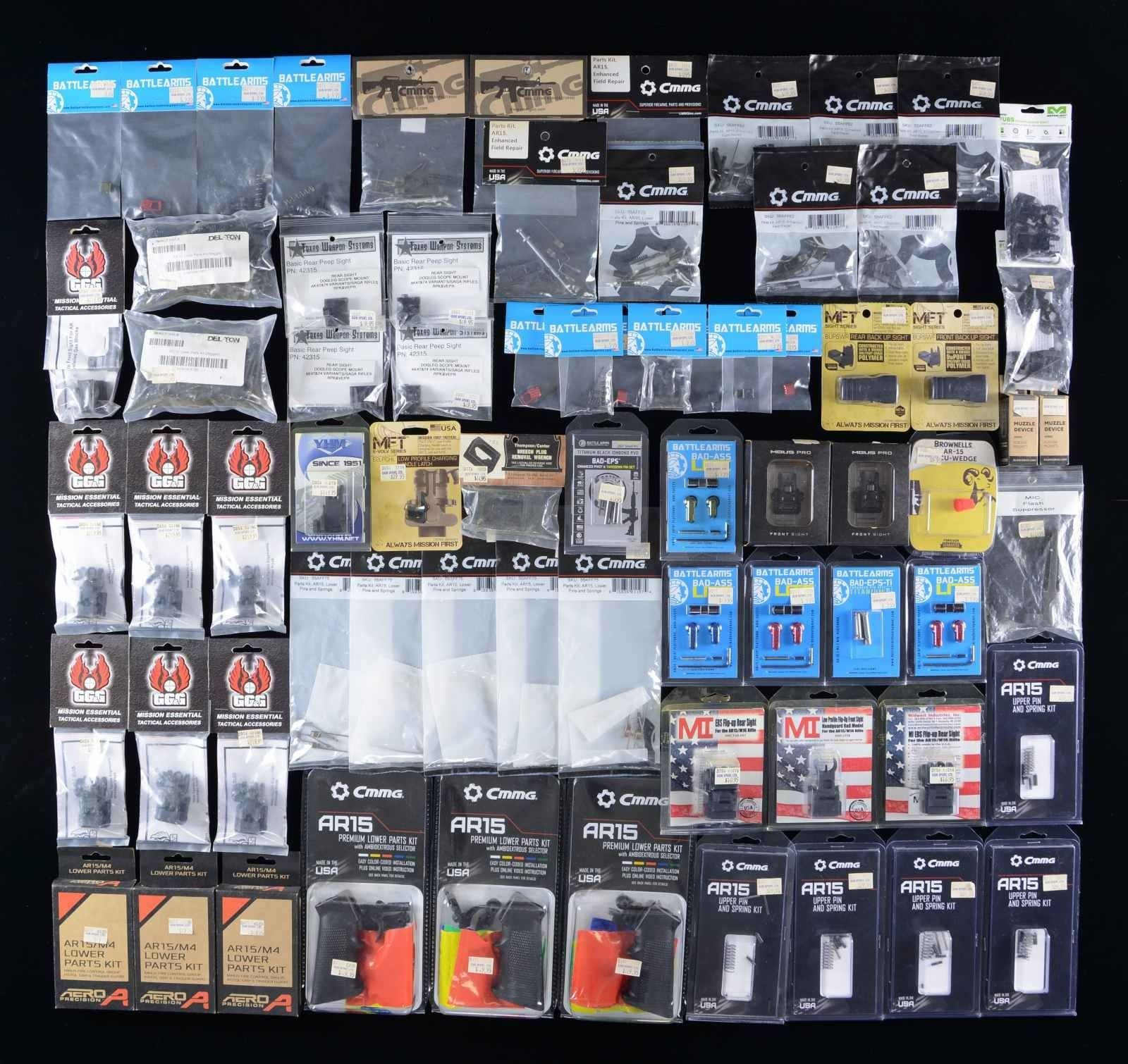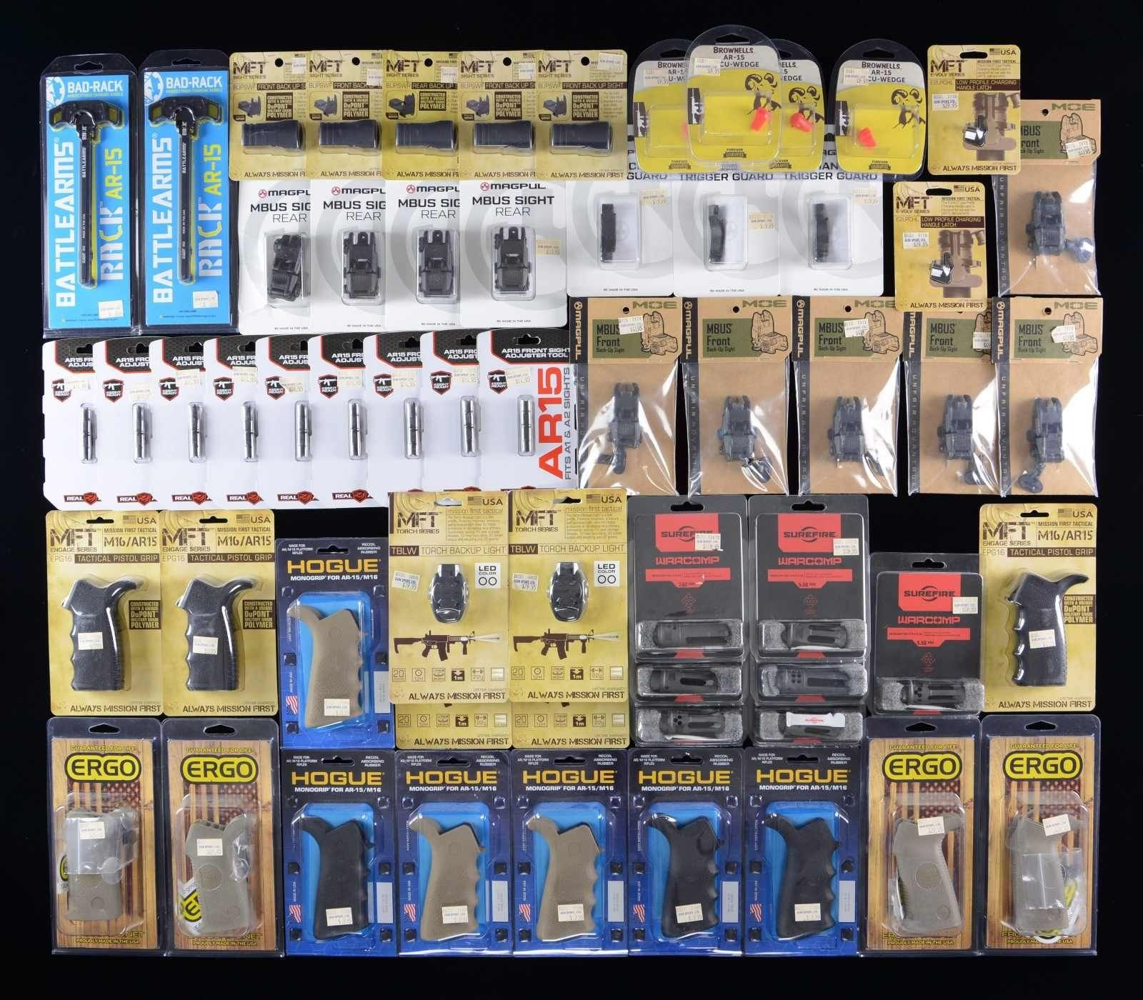 ACCESSORIES. This desirable grouping will allow a wide range of customizing and repair of AR -15 rifles and related firearms. All items in their original packaging. Group contains app. 131 packages. Notable items include; 3 CMMG Premium lower parts kits. / 2 DEL-TON lower parts kits. / 3 AERO PRECISION AR/M4 Lower parts kits. / 4 SUREFIRE WARCOMP Suppressors. / 8 CMMG Parts kits "Enhanced Field Repair". / 6 GG&G A2 BUIS Back up Rear sights. / 4 MAGPUL MBUS Rear sights. / 6 MAGPULL MBUS Front sights. / 2 MEPROLIGHT FUBS Folding Back up sight sets. / 13 assorted pistol grips various makers and colors. CONDITION: all near new in original packaging. PROVENANCE: The Collection of Gun Sport Ltd owned by Jon R. Thomas. (02-20846/RW). $1000- 2000.
