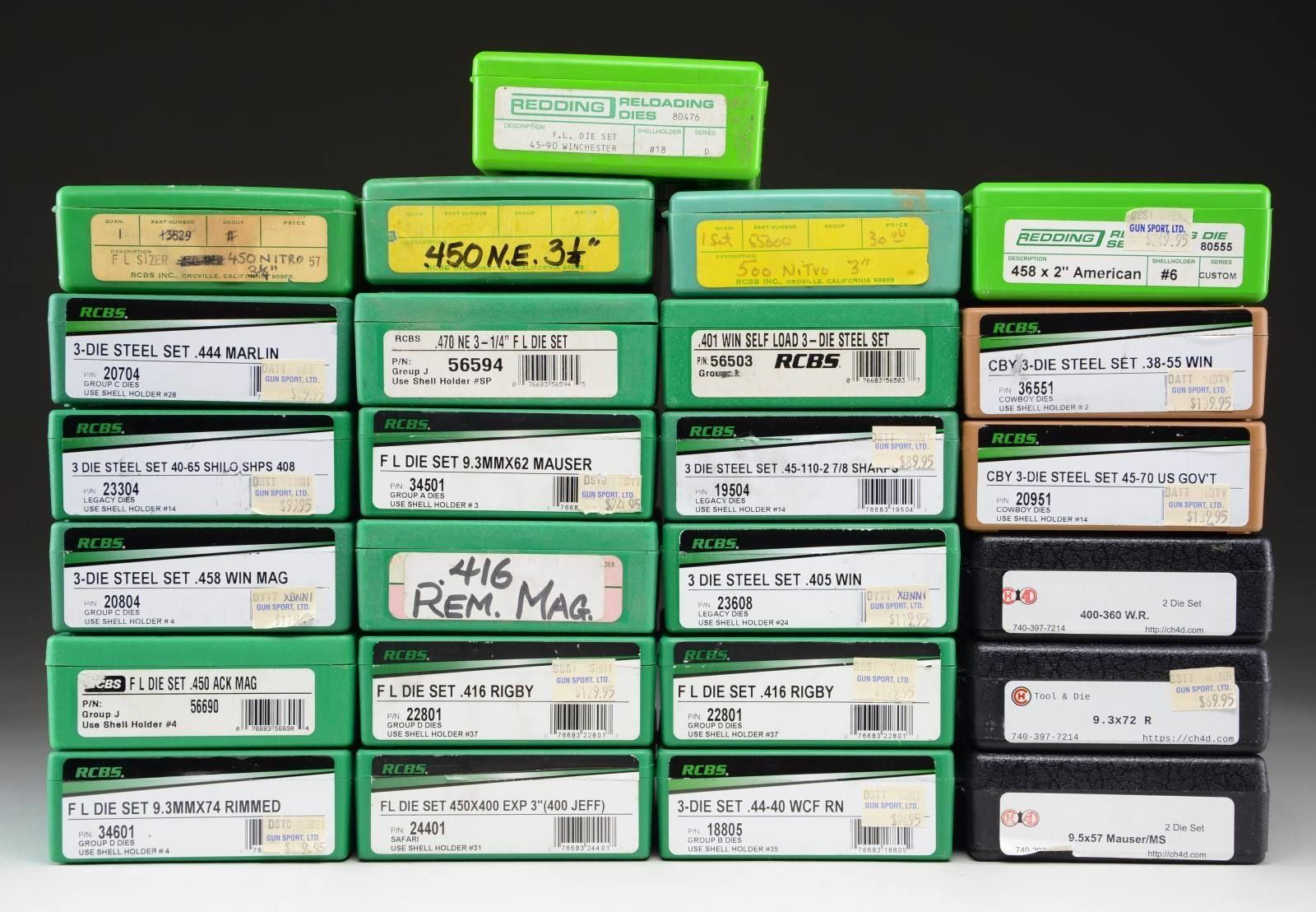 This lot includes the following: RCBS CBY 3-die steel 38-55 Win #36551, RCBS 9.3x62 Mauser #34501, CH 9.3x72R, RCBS 9.3x74mm Rimmed #34601, CH 9.5x57 Mauser/MS, CH 400-360 WR, RCBS 40-65 Shilo Shps 408 #23304, RCBS 401 Win Self Load #56503, RCBS 405 Win #23608, RCBS 416 Rigby #22801, RCBS 416 Rem Mag, RCBS 444 Marlin #20704, RCBS 44-40 WCF RN #18805, RCBS 416 Rigby #22801, RCBS 450NE 3 1/4", RCBS 450x400 Exp 3" (400 Jeff) #24401, RCBS 450 Nitro 3 1/4", RCBS 450 Ack Mag #56690, RCBS 458 Win Mag #20804, RCBS CBY 3-die steel 45-70 US Govt #20951, RCBS 458x2" American #80555, RCBS 45-110 2 7/8 Sharps #19504, Redding 45-90 Win #80476, RCBS 470 NE 3/ 1/4" #5594, RCBS 500 Nitro 3" part #55000. CONDITION: All are in factory packaging. Like new condition for some while others are lightly used. Some may have shell holders included. Plastic cases span from like new, to reflecting shop / shelf wear. PROVENANCE: The Collection of Gun Sport Ltd owned by Jon R. Thomas. (02-20870-7/JZ) $500-800.