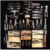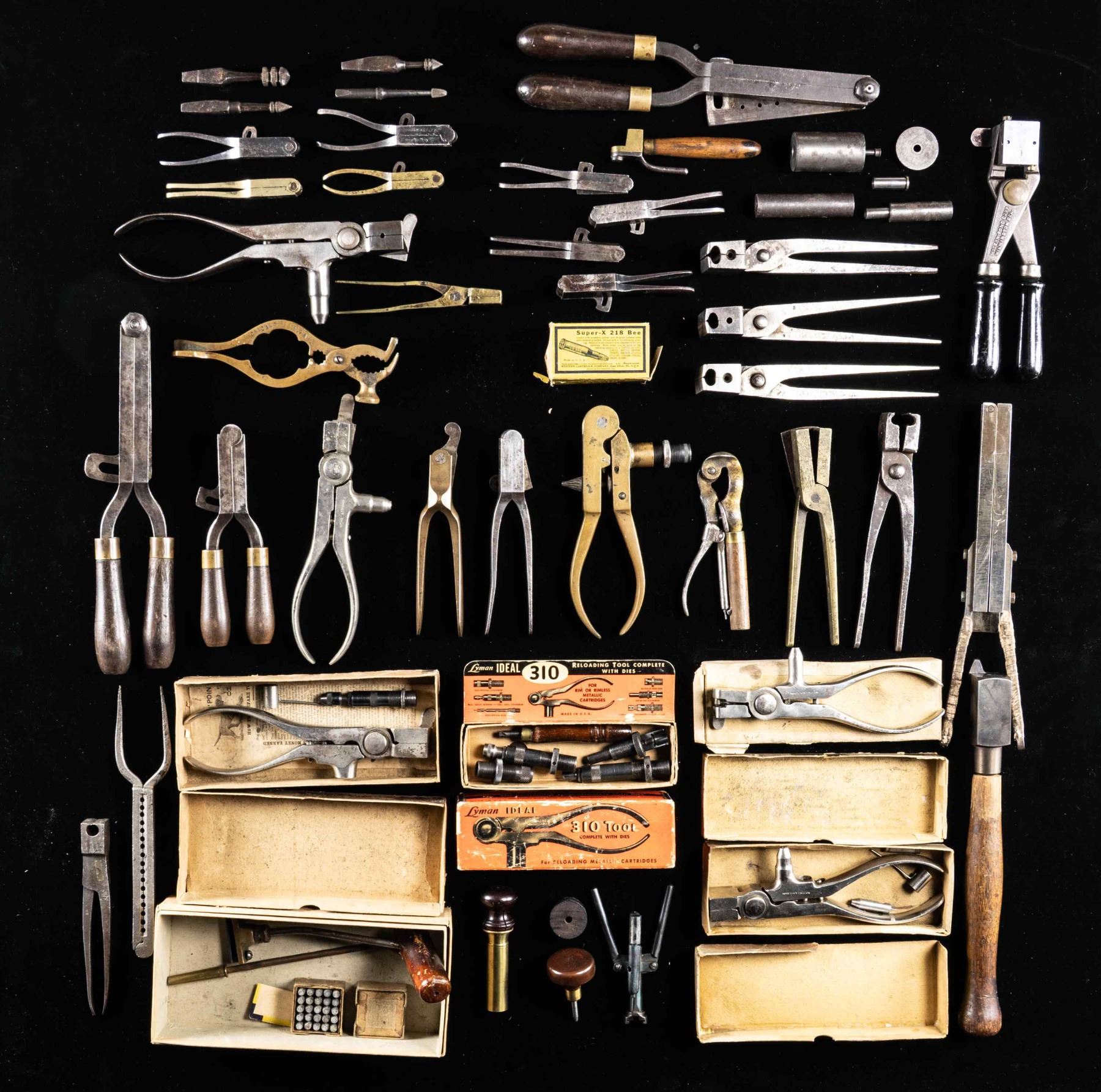 AND FIREARM RELATED ACCESSORIES. Reloading Tools: 1) Ideal No. 6 reloading tool in original green labeled box. Box markings include picture of No. 6 tool which was specifically made for Colt's Lightning, Winchester, Marlin and other magazine rifles and pistols. Marked "IDEAL MANUFACTURING CO. NEW HAVEN, CONN. U.S.A." on the box. Nickel plated tool with blued steel, double adjustable chamber. Chamber is marked "248". Tool is marked "38-55 M.". Integral flat point bullet mold. Original instructions and powder dipper included. Tool is worn with flaking finish. Box has wear, staining and loose corners, but labeling remains in generally legible condition. 2) Ideal No.4 reloading tool with integral bullet mold. Nickel-plated mold is marked "32-20" and has a solid chamber. Tool is in original plain box with yellow labeling. Box marked on the end, "ONE SET, IDEAL NO.4 / 32-20 / LIGHTNING RIFLE". Box has repaired corners and staining with legible labeling. Tool has wear and handling marks, but appears in serviceable condition. 3) Ideal No.4 nickel-plated reloading tool with integral bullet mold. Tool is complete with decapping pin and powder dipper. Housed in it's original factory box. Plain cardboard box with green labeling. Box is labeled on the end "ONE SET, IDEAL NO.4 / 38-40 / COLT'S / LIGHTNING RIFLE". Tool has light wear, but retains most of it's original nickel. Box has staining, wear and partial missing flap. Labeling remains legible. 4) Ideal No.6 reloading tool marked "50 EX" with integral hollow point bullet mold(hollow point insert is not present). Non-adjustable seating chamber. Mold has cleaned appearance returning to gray and patina, but appears to be in serviceable condition. 5) Ideal No.4 reloading tool marked "45 COLT'S". Additionally marked "IDEAL M'F'G CO". One line patent date. Replacement sprue-plate. Tool has notable wear and dents around the bullet mold. / COLT BULLET MOLDS: 1) Colt Model 1855 Rifle Mold. This mold, casting a round ball and a pointed conical bullet, was used with the Model 1855 revolving rifle. The high-quality mold with wooden handles is marked on the sprue-plate "COLTS / PATENT". Bull shows wear, dings and handling marks, notable on the right side of the mold and the end of the sprue-plate. 2) Two well-made gang molds, casting a 44 caliber pointed revolver bullet. One mold appears to cast heel-type bullets and one mold has a single-lubricating groove. These molds are very similar to the Colt gang molds pictured on page 103 of "Reloading Tools of the Black Powder Era 1850-1910 Vol. 2 by Rowe and Curtis". The mold casting the lubricated bullet has "254" on the left side and "254 S" on the right side near the hinge-pin. Molds have moderate wear, turning gray and patina with the normal small dents associated with vintage bullet molds. The sprue-plate screw on the unmarked mold has been filed bright on top. Molds appear to be in serviceable condition. 3) Colt Brass Revolver Mold. Casts one conical and one round ball approximately .290 diameter. Steel sprue-plate marked faintly "COLTS / PATENT". Mold is worn with numerous small dents. 4) Brass mold casting one pointed and one round ball approximately .310 diameter. Mold made without sprue-plate is marked on top "COLTS / PATENT". Well-worn mold with numerous handling marks. 5) Steel mold casting one conical and one round ball approximately .310 diameter. Sprue-plate marked with partially legible Colt's Patent. Mold is overall patina with wear and handling marks. 6) Two iron molds casting a pointed bullet and round ball, both molds marked "COLT'S PATENT" on the sprue-plates. 6) Two late-type dragoon molds casting a round ball and a grooved pointed bullet. 44 caliber. Marked on the sprue-plate "COLT'S / PATENT". Molds show heavy usage with turning gray and patina with numerous small dents. SHARPS MOLDS AND ACCESSORIES INCLUDE: 1) Steel mold. Mold is marked with "SHARPS RIFLE CO / BRIDGEPORT / CONN. / CAL. 44 / 297". Both handles have "27" assembly number. Nose pour bullet with two lubricating grooves. Interior surface of bottom plate is flat. Mold has been cleaned, returning to gray and patina, but appears to be in a worn but serviceable condition. 2) Steel Sharps Mold marked with partly legible "SHARPS RIFLE CO". Additional markings are "CALIBRE 1 1/8 / 405". "473" assembly number appears on both handles. Nose pour mold casts a cylindrical bullet for paper patching. Domed bottom plate. The dome allows for a slightly hollow based bullet. The hollow allows for the tail of a paper patch to be folded-over. Mold is well-worn with oxidation, light pitting and handling marks. 3) Sharps steel mold marked "SHARPS RIFLE CO / BRIDGEPORT / CONN. / CAL. 44 / EXP 277". Handle is additionally marked in script "Old Reliable". "5" assembly number. Base pour grooved bullet has provision for a nose pin(not present) which is the diameter of a .22 rimfire cartridge. This would allow the use of a .22 short cartridge inserted into the bullet to make an explosive bullet. Mold is worn, turning gray and patina with handling marks, but appears serviceable. 4) Steel mold marked on top of handle "NEW MODEL 1850?". "52". Mold is for the Sharps Percussion Rifle and has seen numerous use with heavy dents and handling marks. 5) Cartridge case and bullet swage with base. The body of the case swage is marked "40 SHARPE 285G". The bullet swage is unmarked. Base is marked "40". 6) Steel headspace gauge marked ".40-90 / SHARPS / STRAIGHT / NO 28". Gauge is in very good condition. / MAYNARD MOLDS: 1) Steel mold marked on the right side of the body "MAYNARD ARMS CO / WASHINGTON / MANUFACTURED BY / MASS. ARMS CO / CHICOPEE FALLS". Mold casts a single pointed bullet with one lubricating groove. Bullet measures approximately .520 at the base. Mold is turning gray and patina with spots of oxidation and pitting, but appears to remain serviceable. 2) Two cavity bullet mold. Mold is designed to cast two different bullet weights. Mold is solid and bullets ar