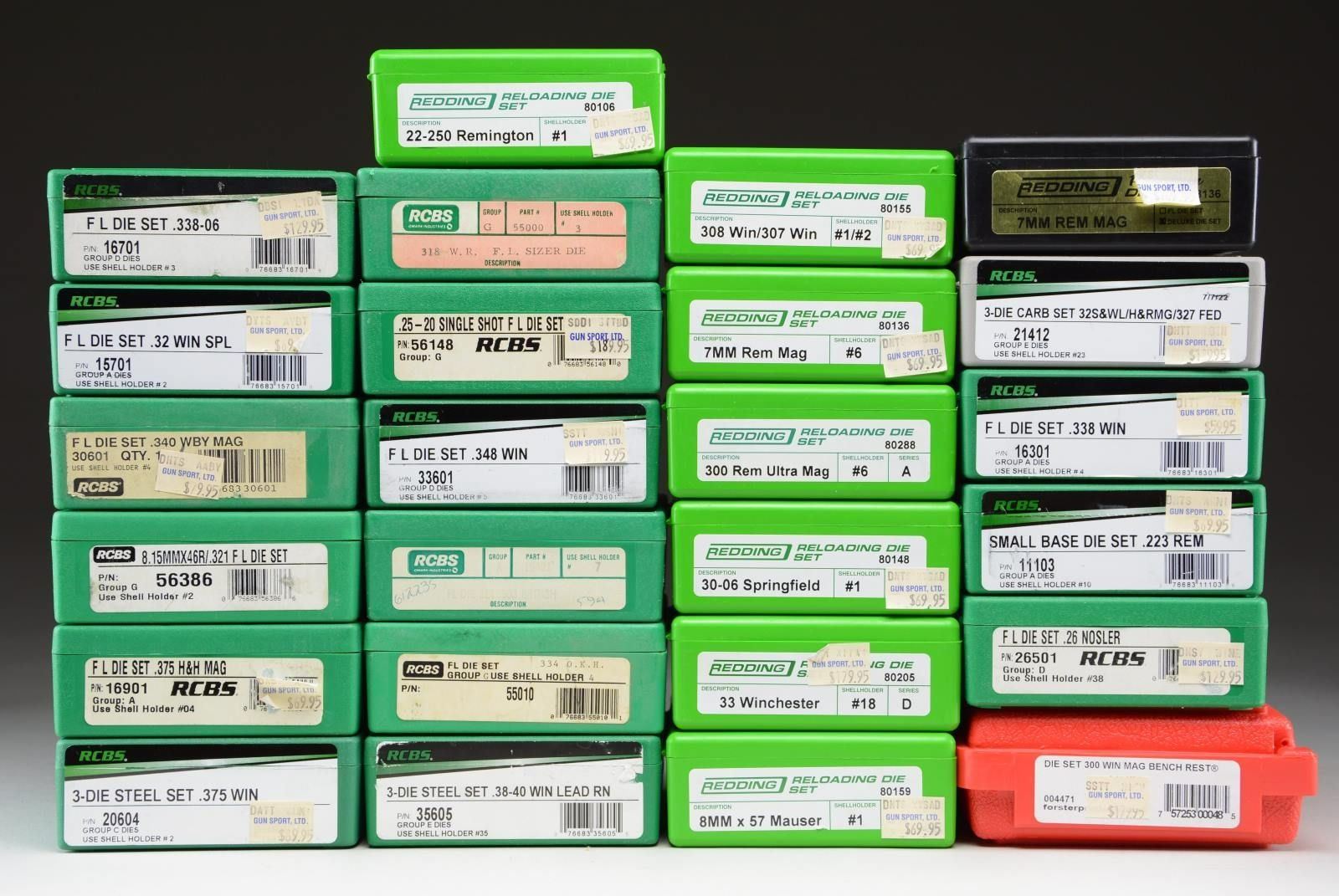 Grouping includes the following: RCBS small base die set 223 Rem #11103, Redding 22-250 Rem #80106, RCBS 25-20 single shot, #56148, Redding 7mm Mag #80136, Redding 308 Win / 307 Win #80155, Redding 300 Rem Ultra Mag #80288, RCBS 303 British 154017, Redding 30-06 Springfield # 80148, Redding 7mm Rem Mag #68136, Forster 300 Win Mag Bench Rest #004471, RCBS 26 Nosler #26501, RCBS 318 W.R. #55000, RCBS 3-die carb set 32S&WL/H&R Mag/327 Fed #21412, RCBS 334 O.K.H. #55010, RCBS 338 Win #16301, RCBS 32 Win Spl #15701, Redding 33 Win #80205, RCBS 338-06 #16701, RCBS 340 Wby Mag #30601, RCBS 348 Win #33601, Redding 8x57 Mauser #80109, RCBS 8.15x46R / 321 #56386, RCBS 357 Win #20604, RCBS 375 H&H Mag #16901, & 38-40 Win Lead RN 35605. CONDITION: All are in factory packaging. Like new condition for some while others may be lightly used. Some may have shell holders included. Plastic cases span from like new, to reflecting light shop / shelf wear. PROVENANCE: The Collection of Gun Sport Ltd owned by Jon R. Thomas. (02-20870-6/JZ) $500-800.