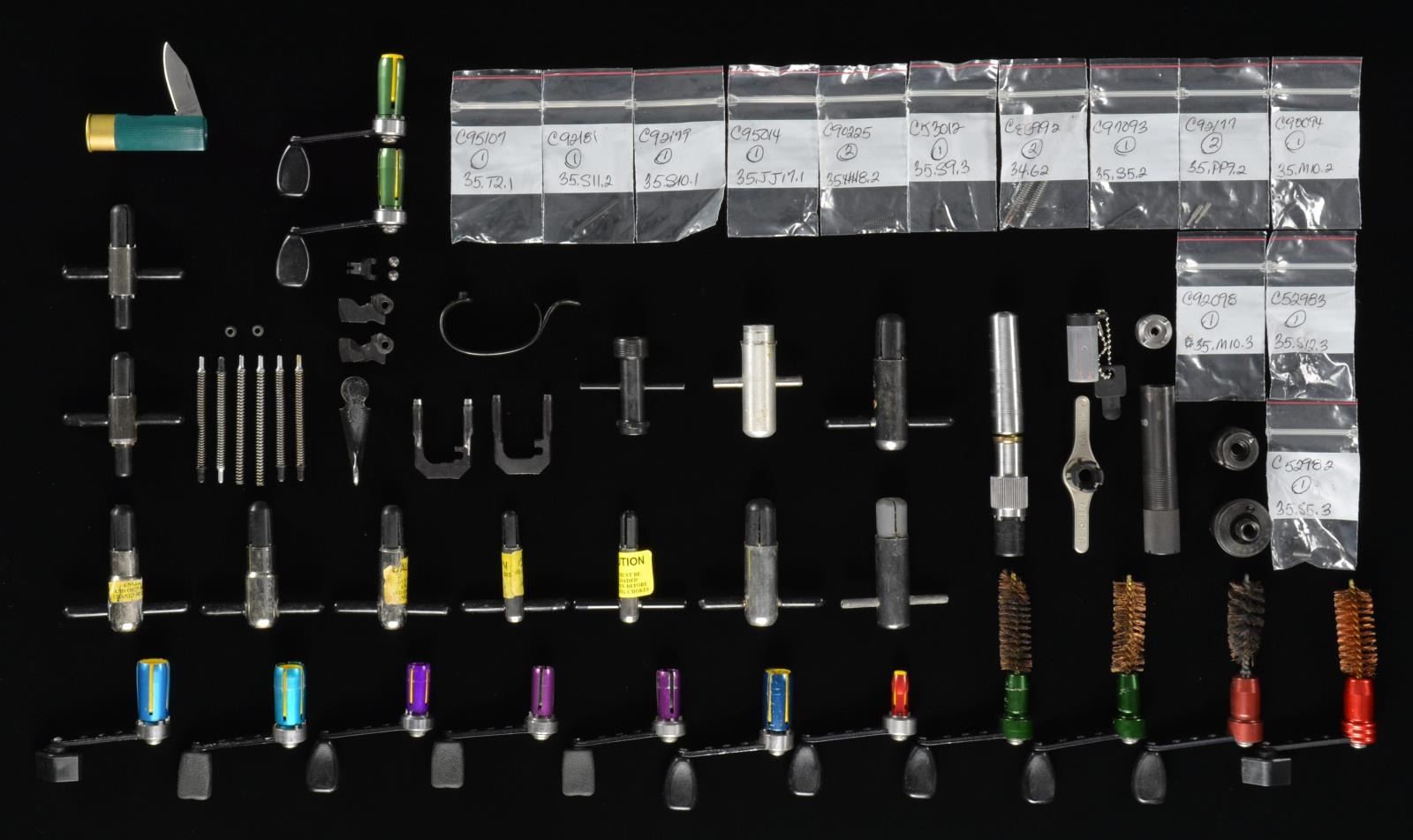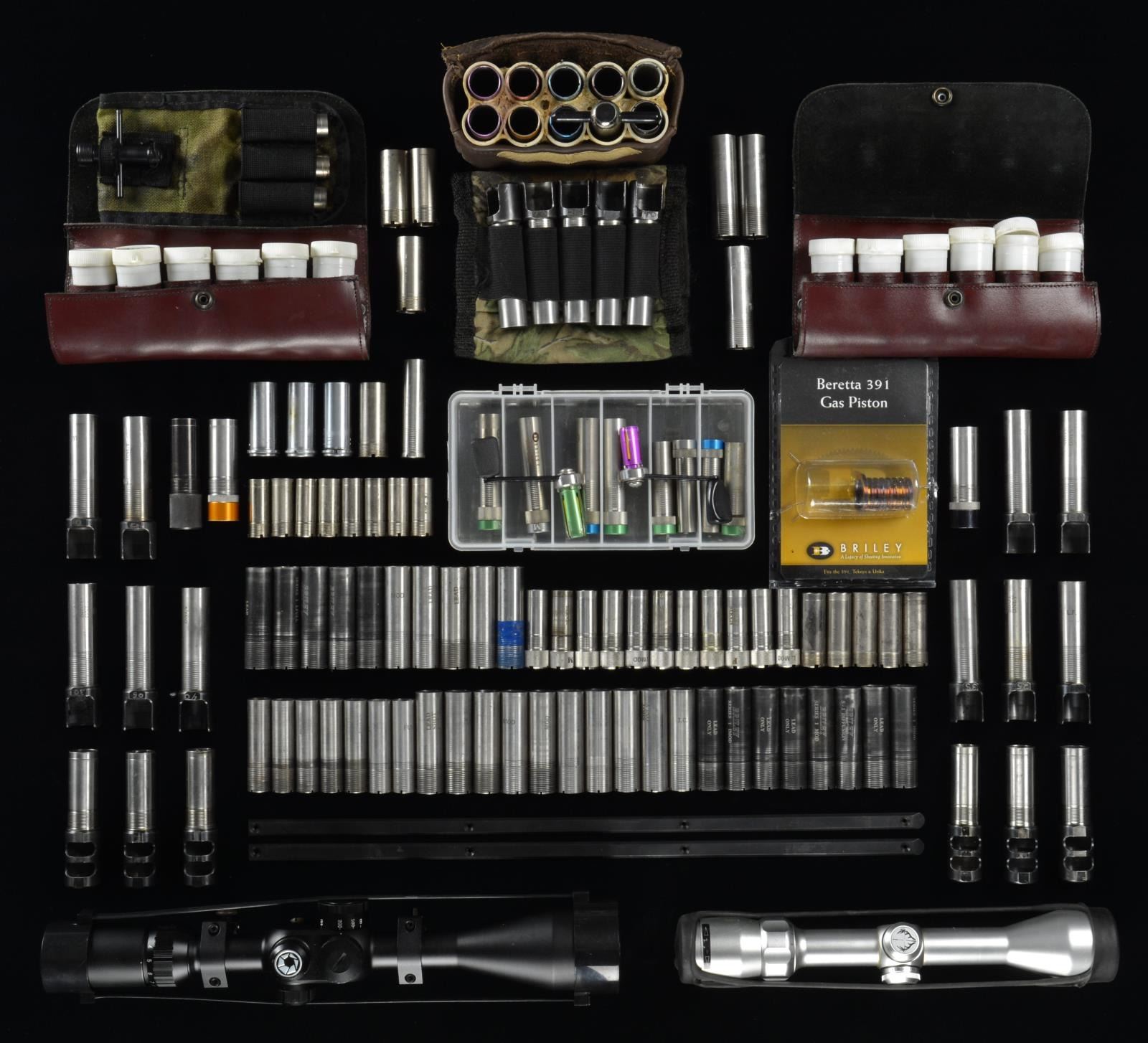 ACCESSORIES: 70+ Briley choke tubes for 12, 20, 28 & 410 Ga. assorted lengths & chokes. / 10+ Beretta chokes for 12, 20 & 28 Ga. / 20+ Unidentified choke tubes. / 4 Spinner type chamber brushes. / 9 Spinner style choke wrenches. / 13 Twist style choke wrenches. / 1 Combination choke wrench & choke gauge. / 3 Choke wrench boxes.