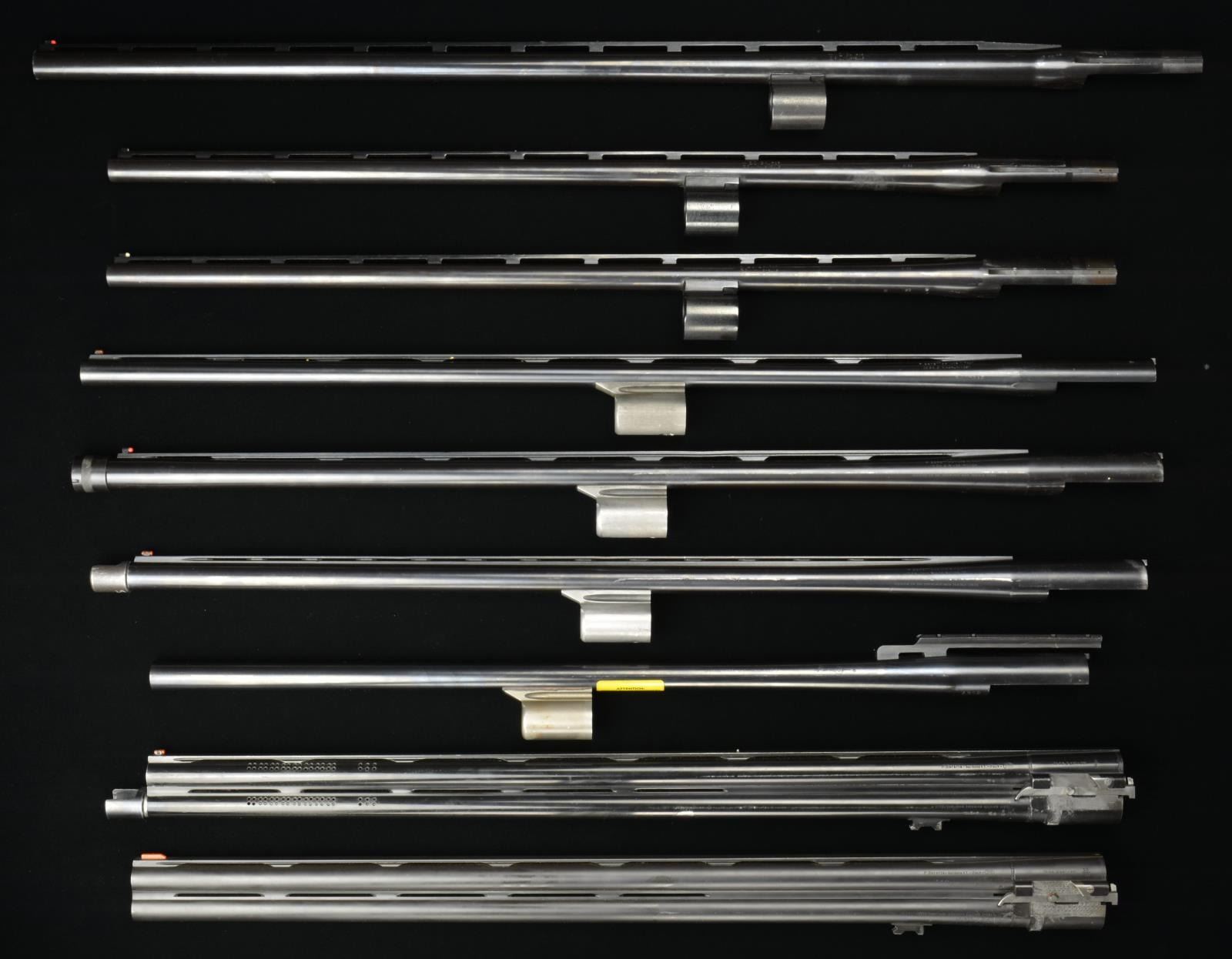 4) BERETTA. Cal. 12 Ga., 2 3/4". S# E70649F. Length: 26" VR w/ added Briley Skeet tube having 3/4" diameter semi circular extension. Original choke marking "IC". Bbl. is not model marked, but appears to fit an A302 or similar model. Red fiber optic front sight w/ missing bead. CONDITION: 90% blue. Very good bright bore.
