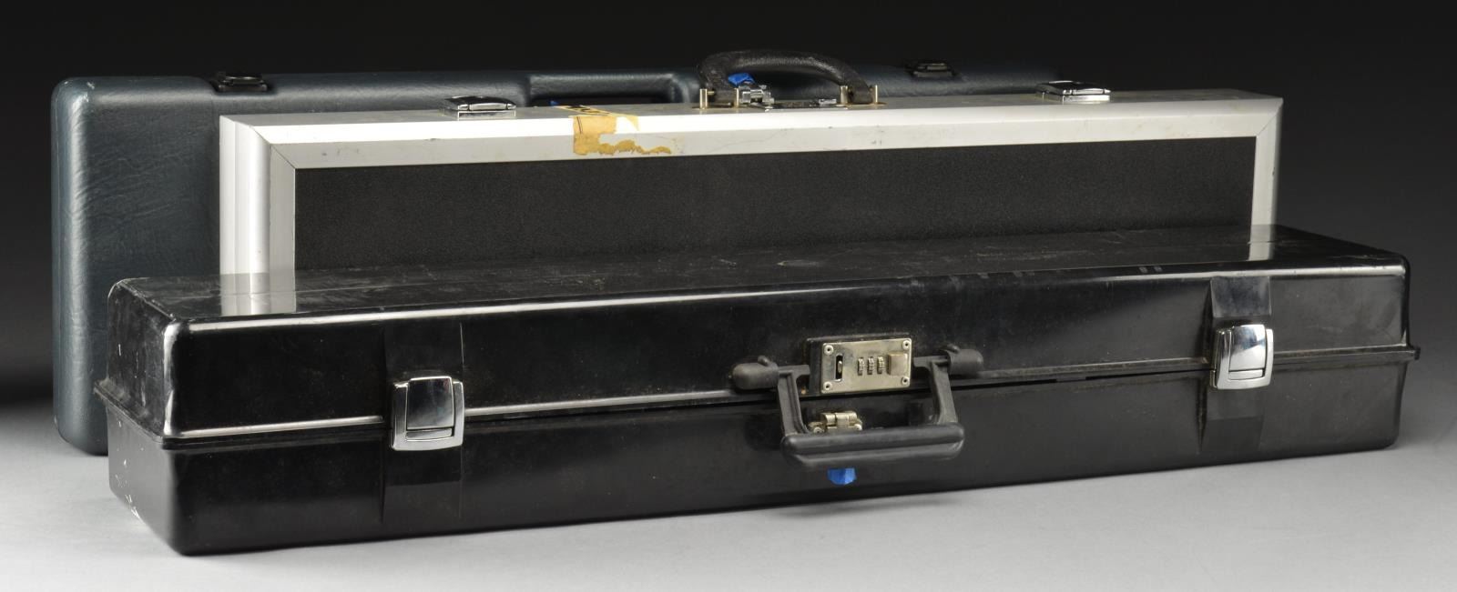 1) Aluminum Americase for O/U or SXS Shotgun. Bbl. length up to 31" overall length. Very good red velour fitted interior. Case exterior shows some scratches & marks w/ remaining tape residue.