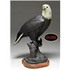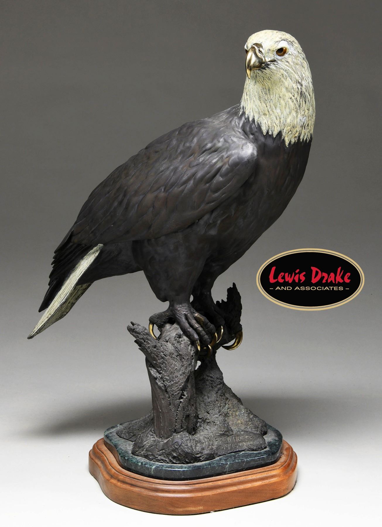 PROMINANT SCULPTOR FRED HOPPE. The massive eagle is approx. 27 1/4" tall & 18" wide. The bronze is marked on the base "FRED HOPPE / 1996 / 50-50". The eagle is colored, having a brown body w/ the white head & tail given a white pigmented enamel wash for a more natural appearance. The head is fitted w/ brass eyes & has a gold colored beak. The claws are also gold colored. The perch has a usual patina'd bronze appearance. The base is dark marble over walnut & has an irregular shape. CONDITION: eagle has very light handling wear while having a nice visual appearance. Base has light handling wear. PROVENANCE: from the renowned collection of quality sporting arms from Lewis Drake together with inventory of Lewis Drake Associates. (02-23569/RW). NON-GUN. $1,000-2,000.