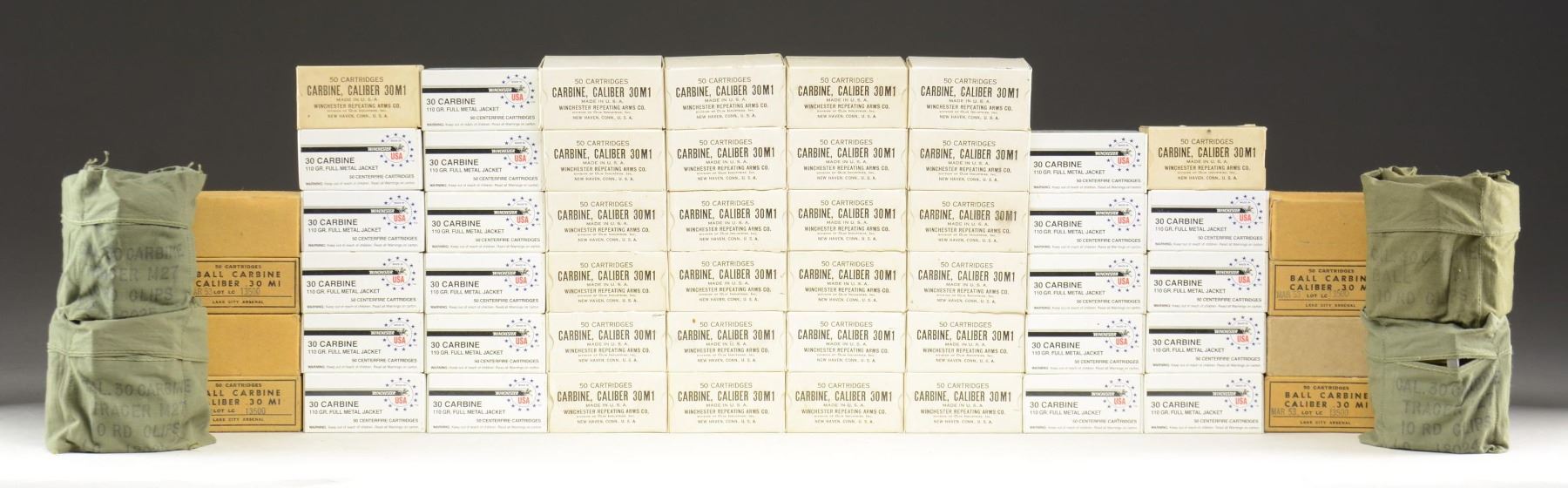 This lot consists of the following 30 Carbine ammo housed in .50 Cal GI ammo cans: 1) About 550 rds. of mixed surplus ammo with most on stripper clips & in bandoliers. 2) Fifty 50 rd. boxes of varied Winchester boxes of 110 gr. FMJ ammo. CONDITION: some ammo shows scattered tarnish. PROVENANCE: The Estate Collection of Charles Wagner. (02-23107-3/MJC). $1000-1500.
